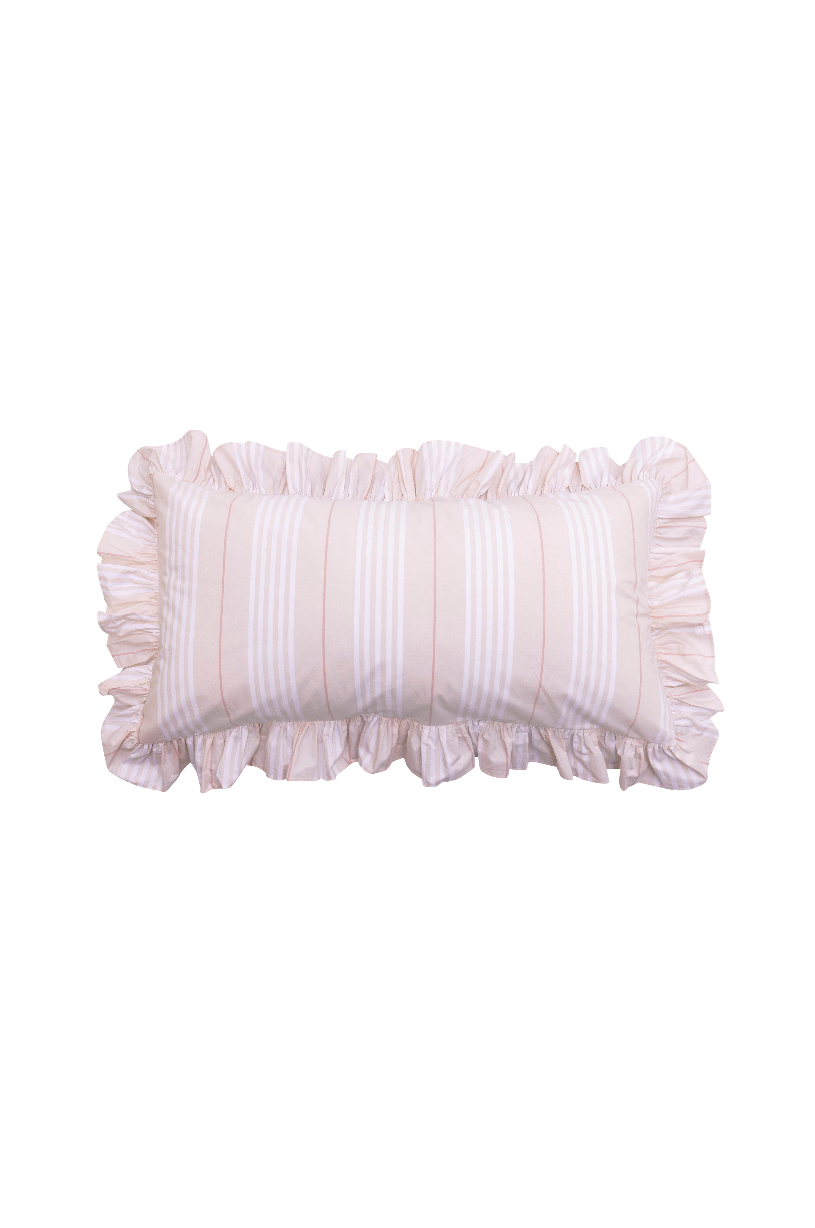 Pudebetræk af kæmmet bomuldspercale. Trådantal 300. Vævet i et tidløst stribet design og afsluttet med en legende 8 cm flæsevinge. Overlappende lukning.