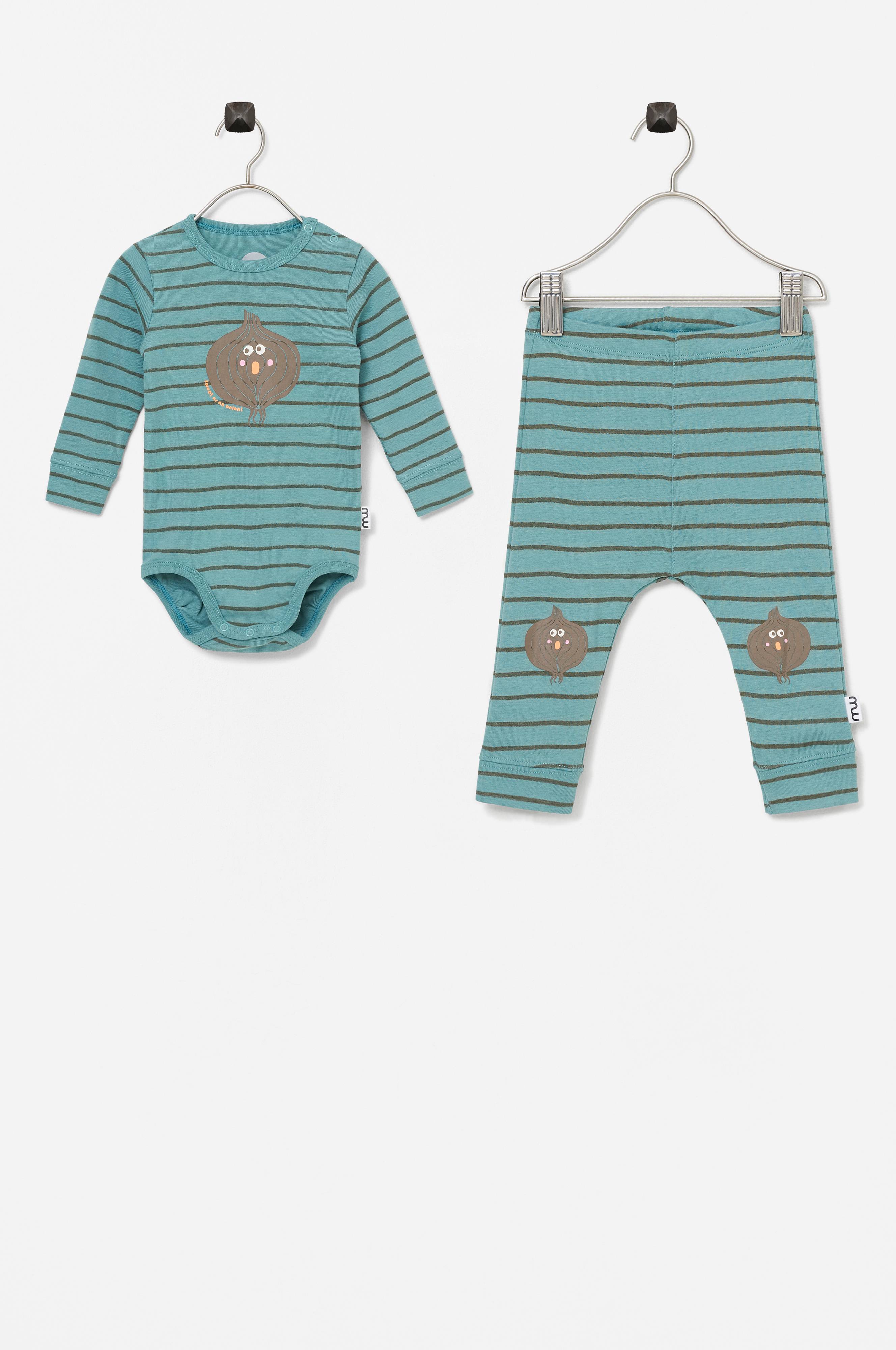 Todelt sæt i bomuldsjersey. Langærmet body med trykknapper på den ene skulder og i skridtet. Bukser med elastisk talje og ribkant i benkant.