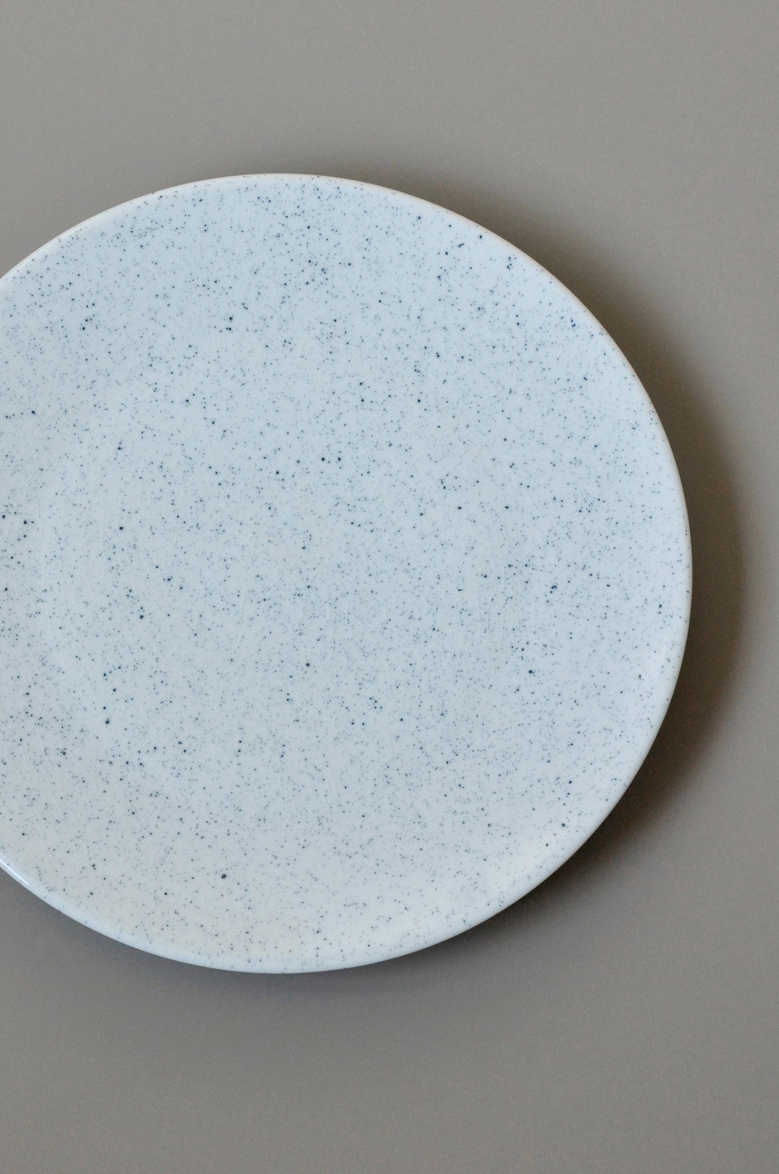 Lille tallerken i keramik som er støbt i hånden. Tallerkenen har nøje udtænkte dimensioner lige fra højden til størrelsen på overfladen, hvor man lægger maden. Den ser almindelig ud, men hver millimeter af denne tallerken er nøje udtænkt, så den er funktionel, smuk samt alligevel ser ud som en helt konventionel tallerken. Tallerkenen har et fintkornet stænkmønster, der har fået en sløret karakter af celadonglasuren. Stænkmalingen er lavet i hånden med specialskårne børster og derefter glaseret i klassisk celadon, der giver fine detaljer i stænkningen samt en svagt krakeleret overflade, der er meget hård og holdbar. Det sorte stænkmønster kan variere på de forskellige servicedele. Størrelsen passer perfekt som lille tallerken til morgenmaden, til forretten eller at have stående fremme til at lægge nøgler, smykker eller andet, på. Mimous keramik PURE er en del af en serie servicedele, som er fremstillet i Lampang i det nordlige Thailand. Området er kendt for sit naturligt fine ler med højt kaolindhold, hvilket gør keramikken virkelig holdbar. Hver del støbes i håndlavede forme og glaseres derefter med en af Mimous glasurer. PURE-servicet støjer ikke og har en udstråling, som man ikke bliver træt af. Servicet er kendetegnet ved de flotte proportioner, som bliver solide og robuste på grund af den fine ler og de hårde glasurer. Tåler mikrobølgeovn og maskinopvask. Størrelse: 20 cm