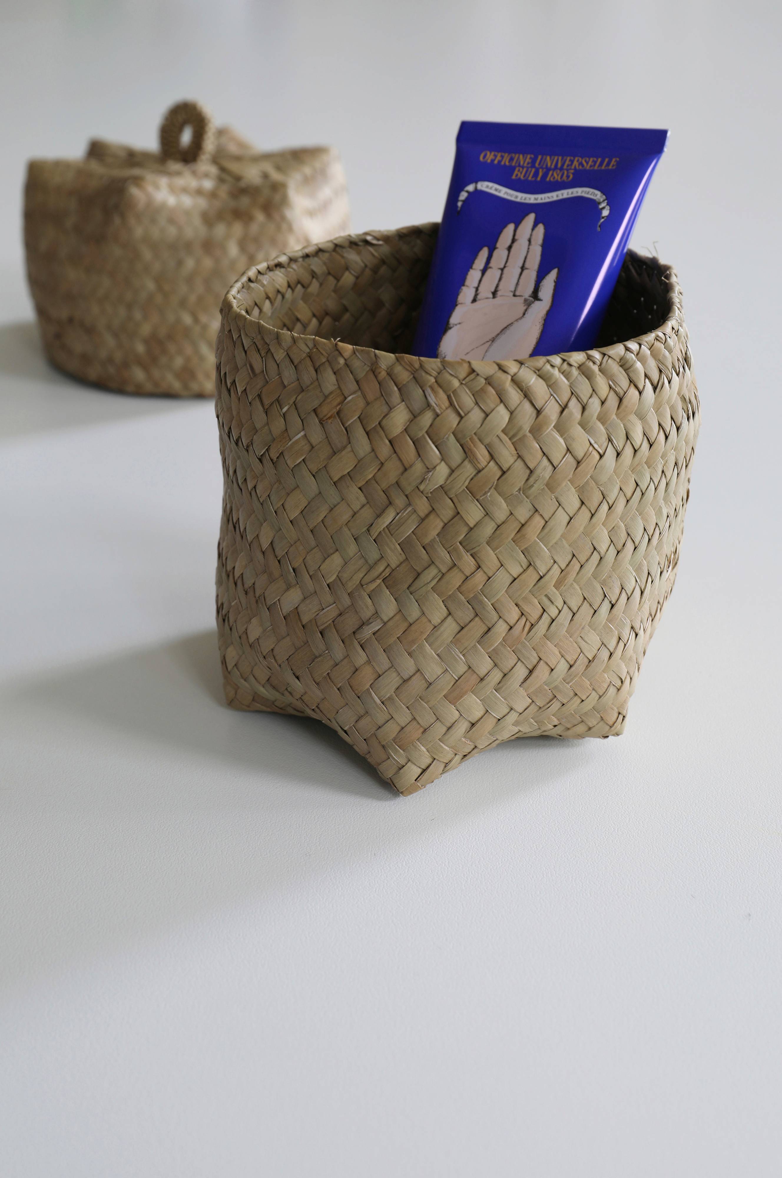 Beholder med låg som er fremstillet af søgræs. Diameter 12 cm, højde 13 cm