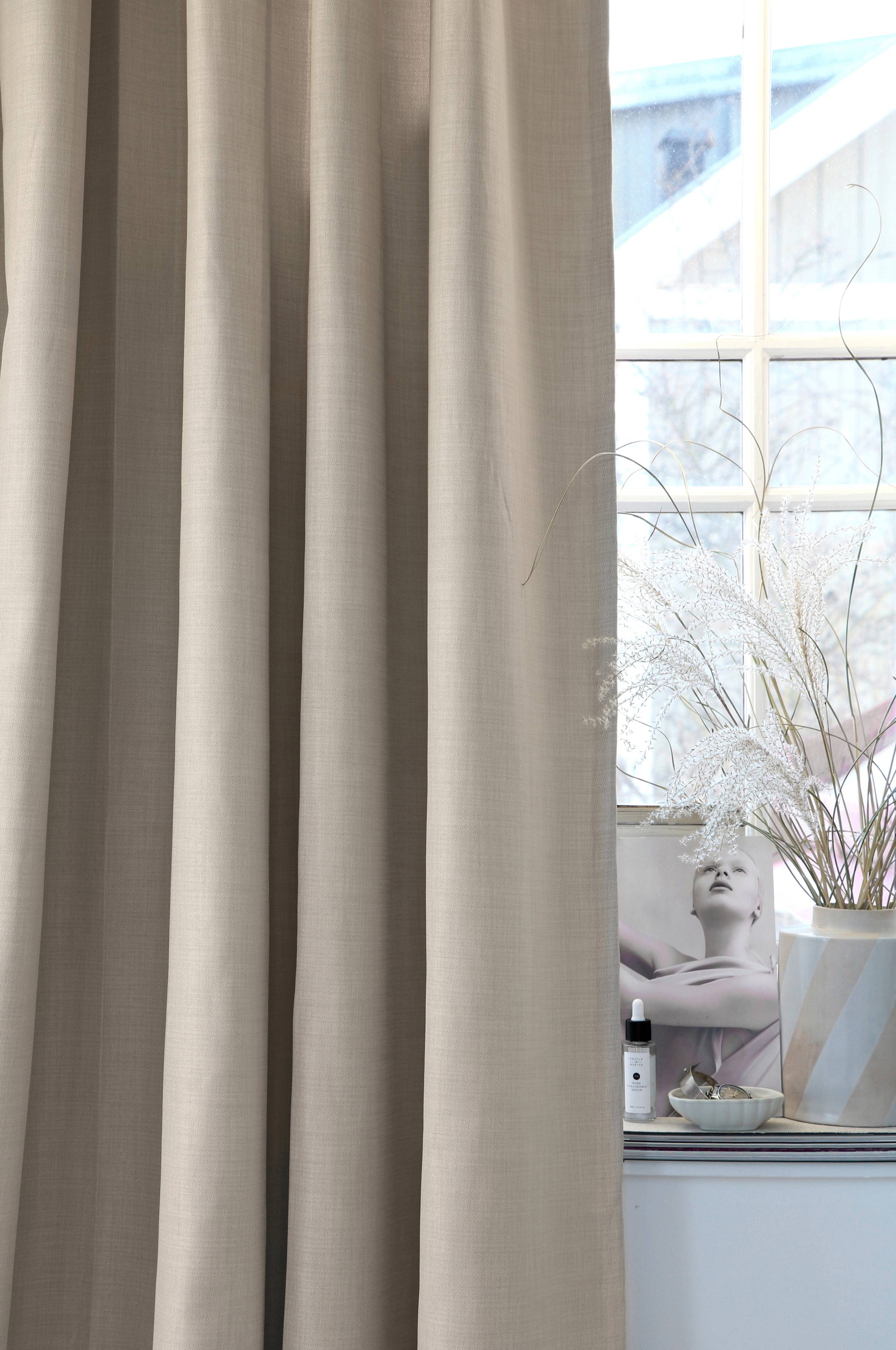 Luksuriøst hotelgardin med meleret forside som er 290 cm bredt, hvilket gør at det passer både til almindelige vinduer og til store vinduespartier. Det mørklæggende gardin er syet med rynkebånd og falder smukt, den matte overflade blokerer 92% af lyset. Mørklæggende gardiner inddeles i forskellige grader. Dette er den laveste grad af lysblokering, hvilket betyder at man ser konturer gennem stoffet i kraftigt sollys. Hvis man ønsker et mere blokerende gardin vælges Mimous Hotelmørklægning eller for at blokere lyset helt - gardin Shelby eller Chicago. Gardinet har et skræddersyet look med klassiske, usynlige sidesømme og dobbelt oplæg forneden, så det får den rigtige tyngde. 4-fingerkrog medfølger til hver gardinlængde med rynkebånd. Fingerkrogsophæng passer til alle skinner med glidere og almindelige gardinstænger med gardinringe og stropper. 4-fingerkrog anvendes til at skabe flotte folder i gardinet, som giver et velsyet indtryk og lader gardinerne komme til deres ret. Stoffet opfylder alle de sikkerhedskrav angående brand, som stilles til gardiner i det offentlige rum. Og det er OEKO-TEX® Standard 100 certificeret, det vil sige at produktet er testet for at sikre, at det ikke indeholder sundhedsskadelige stoffer. Vaskeanvisning: 60 grader skånevask eller kemisk rens. Bredde 290 cm Højde 250 eller 290 cm. Materiale: 100% polyester