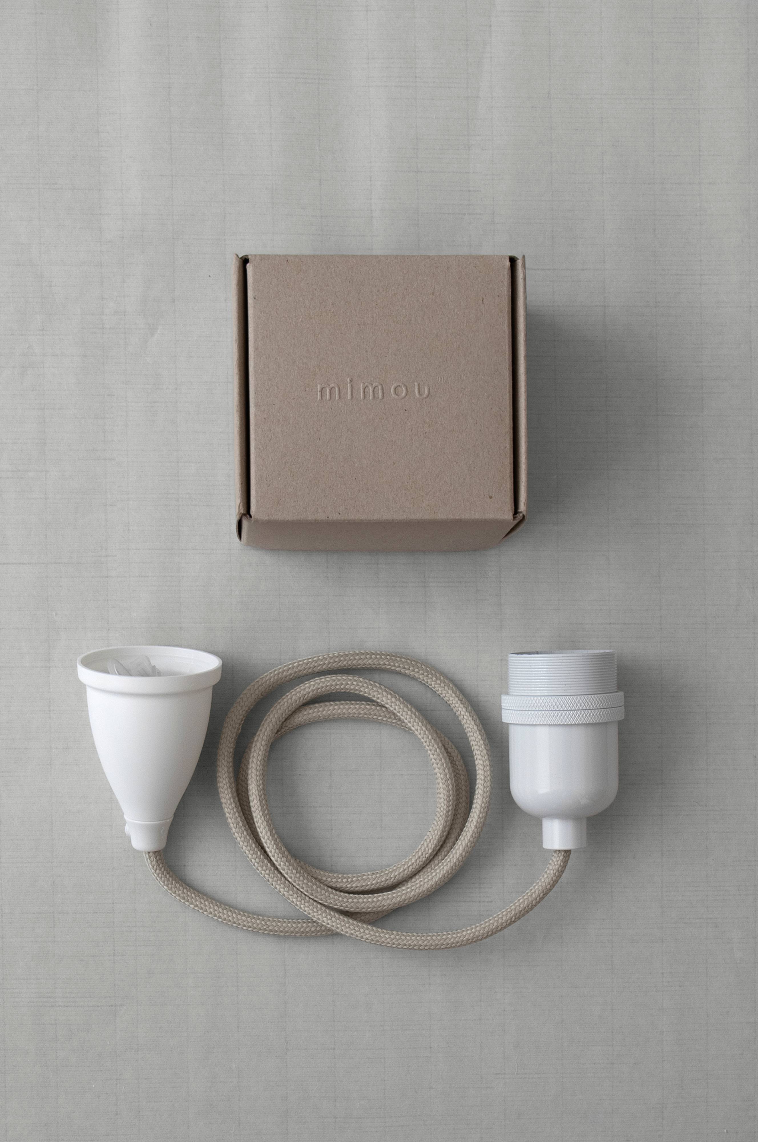 Svenskfremstillet ophæng, der passer til Mimous håndlavede papirlamper. Loftophæng med 1,2 meter stofledning, E27 fatning i metal og baldakin af silikone. Lampestik er vedlagt separat for egen installation.
