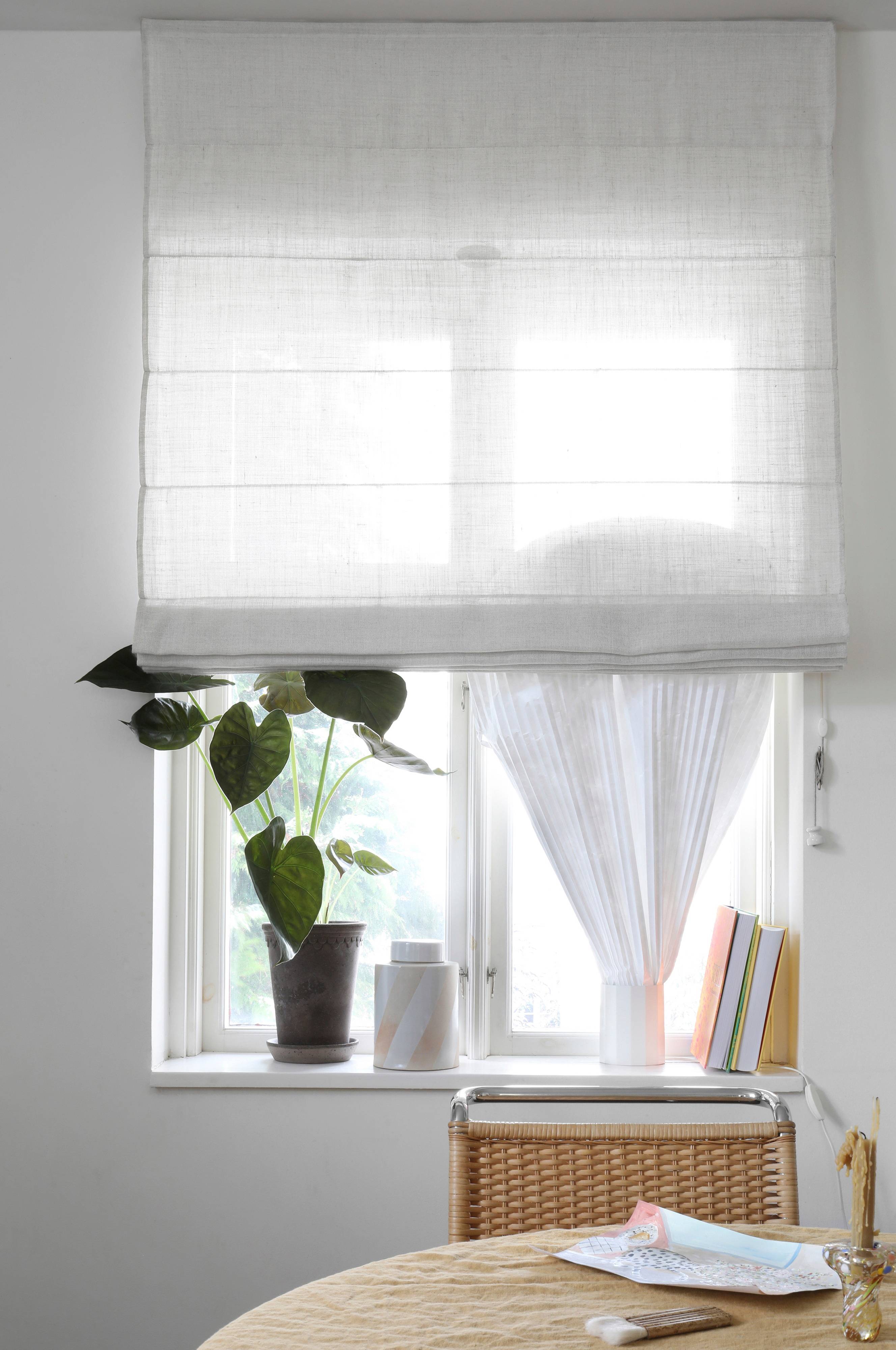 Mimous liftgardin er 220 cm langt hvilket gør at det også passer i lidt højere vindue samt de fleste glasdøre. Stoffet er vævet med kraftige hørtråde og genindvundet polyester og har en smuk tekstur, som lyset filtrerer igennem, men stadig er let nok til at se igen. Liftgardinet er skræddersyet med smalle sidefolder og med lægter, der giver stramme læg ved foldning. Afstanden mellem lægterne gør, at liftgardinet foldes smukt sammen, uanset hvilken højde du vælger at have det på. Det er lige så fint i fuld optrukket position, som når det hænger helt ned eller er højdejusteret, hvor sømmene til lægterne er placeret. Det kan naturligvvis justeres frit. Stoffet er monteret med velcrobånd på en stabil aluminiumsprofil, der kan monteres både i loft og på væg. Linerne fra lægterne samles i en linedeler som er designet til at blive separeret, hvis dit barn eller et husdyr bliver viklet ind i linerne. Længst nede på snøren af vævet svensk hør sidder en klassisk porcelænsknop fremstillet i Bromölla. Beslag og snorholder medfølger. Set forfra sidder snoretrækket i højre side. Det er vigtigt at snøre linen ordentligt rundt om knoppen hver gang højden justeres, så der ikke hænger lange snore ned, som små børn eller husdyr kan blive viklet ind i. Stoffet er OEKO-TEX® Standard 100 certificeret, det vil sige at produktet er testet for at sikre, at det ikke indeholder sundhedsskadelige stoffer.