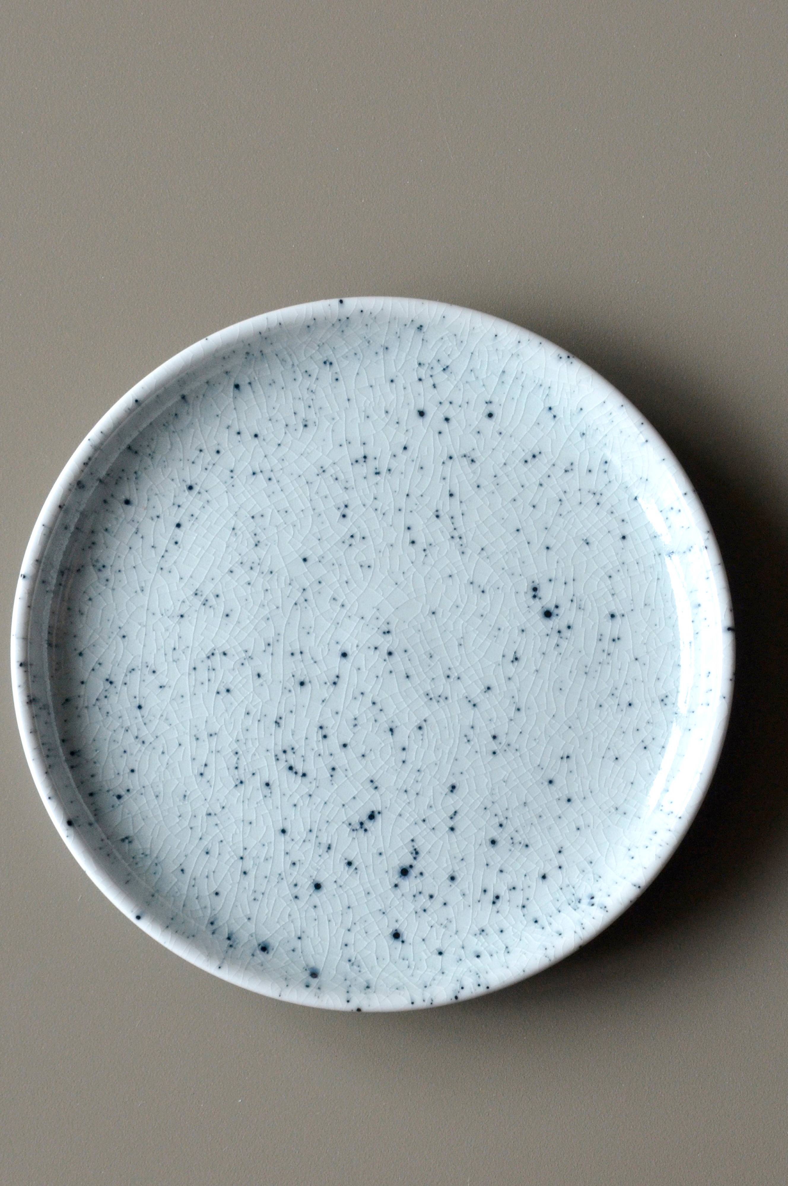 Minifad i keramik som er håndstøbt. Størrelsen er perfekt som smykkefad, til nøgler eller som desserttallerken. Minifadet har et finkornet stænkmønster, der har fået en sløret karakter af celadonglasuren. Stænkmalingen er lavet i hånden med specialskårne børster og derefter glaseret i klassisk celadon, der giver fine detaljer i stænkningen samt en svagt krakeleret overflade, der er meget hård og holdbar. Det sorte stænkmønster kan variere på de forskellige servicedele. Mimous keramik PURE er en serie servicedele, som er fremstillet i Lampang i det nordlige Thailand. Området er kendt for sit naturligt fine ler med højt kaolindhold, hvilket gør keramikken virkelig holdbar. Hver del støbes i håndlavede forme og glaseres derefter med en af Mimous glasurer. PURE-servicet støjer ikke og har en udstråling, som man ikke bliver træt af. Servicet er kendetegnet ved de flotte proportioner, som bliver solide og robuste på grund af den fine ler og de hårde glasurer. Tåler mikrobølgeovn og maskinopvask. Størrelse 16 cm