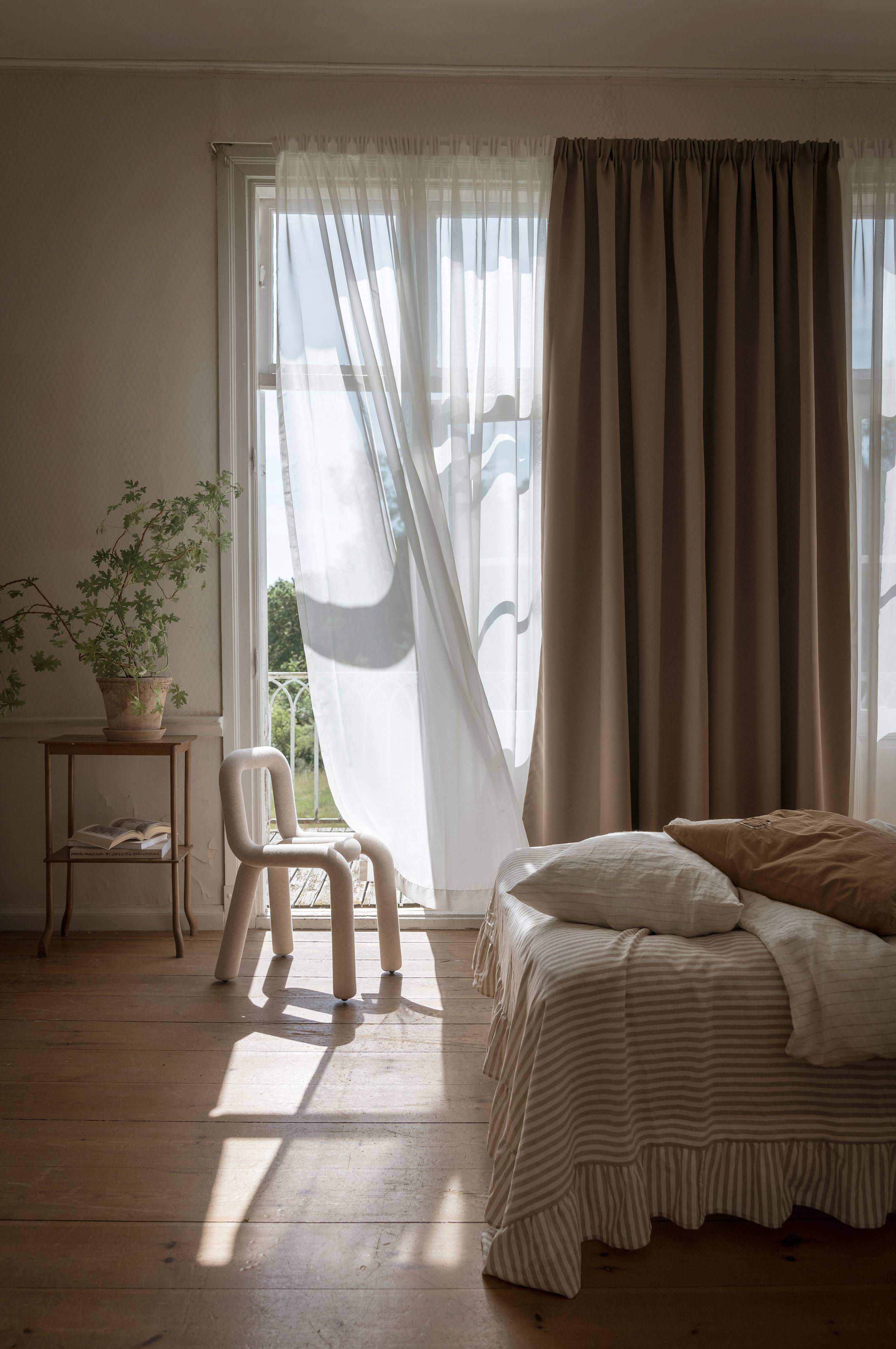 Klassisk hotelgardin som er 290 cm bredt, hvilket gør at det passer både til almindelige og til store vinduer. Det mørklæggende gardin er syet med rynkebånd og falder smukt, den matte overflade blokerer 96% af lyset. Farven er smuk og passer virkelig godt sammen med Mimous luftige hotelgardin, som giver soveværelset et luksuriøst hotellook. Gardinet har et skræddersyet look med klassiske, usynlige sidesømme og dobbelt oplæg forneden, så det får den rigtige tyngde. 4-fingerkrog medfølger til hver gardinlængde med rynkebånd. Fingerkrogsophæng passer til alle skinner med glidere og almindelige gardinstænger med gardinringe og stropper. 4-fingerkrog anvendes til at skabe flotte folder i gardinet, som giver et velsyet indtryk og lader gardinerne komme til deres ret. Stoffet opfylder alle de sikkerhedskrav angående brand, som stilles til gardiner i det offentlige rum. Og det er OEKO-TEX® Standard 100 certificeret, det vil sige at produktet er testet for at sikre, at det ikke indeholder sundhedsskadelige stoffer. 60 grader skånevask eller kemisk rens. Bredde 290 cm. Sælges i 1-pak.