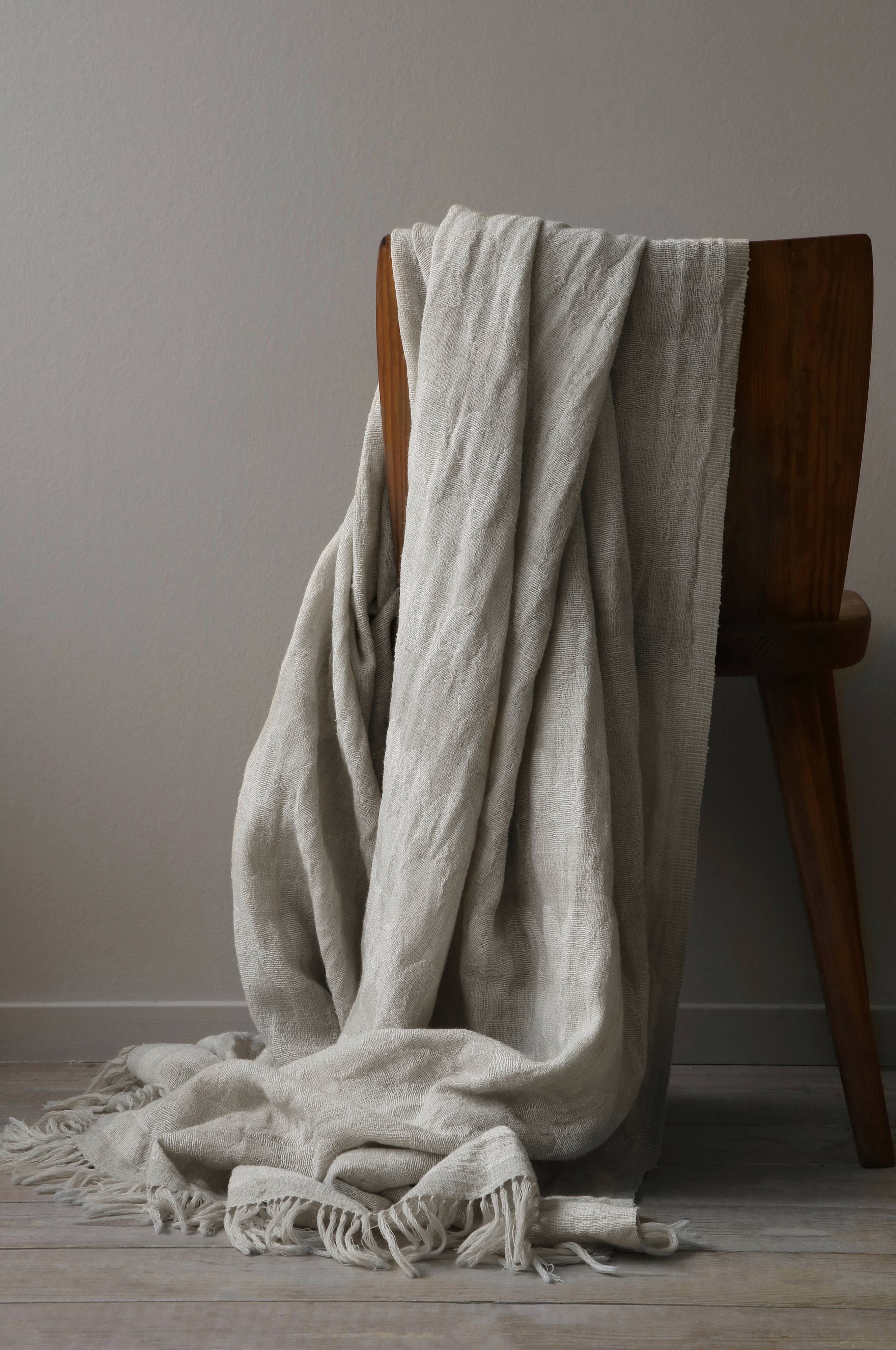 Dekorativ plaid der er vævet i hånden af håndspundne tråde af silke og uld. Det smukke mønster skifter i bløde farvetoner. Da plaiden er ekstra stor kan den anvendes som sengetæppe og draperes i fodenden af sengen. Plaiden består af 60% uld og 40% silke. 30 grader skånsom maskinvask på uldprogram, kemisk rens eller forsigtig vask i hånden i koldt vand.