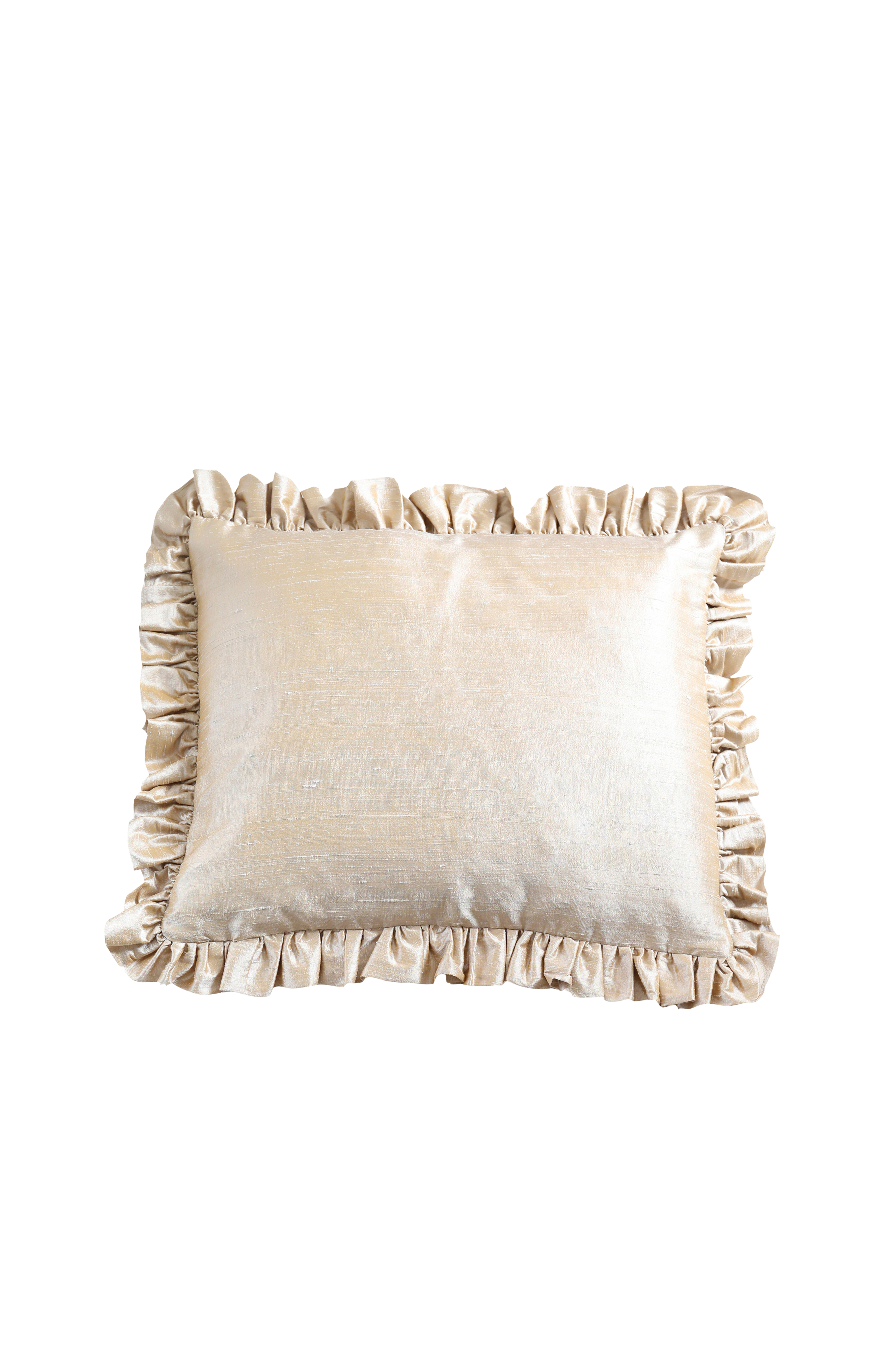 Håndlavet pude med flæse af dobbelt stof. Den store pyntepude har en side af kraftig portugisisk hør og en side af genbrugt, håndvævet silke. Genbrug af materialer i stedet for ny produktion er et mere bæredygtigt valg og et skridt til at reducere tekstilspild. Sælges inklusive monteringspude med andefjer. Størrelse: 50X60 cm + 7 cm flæse