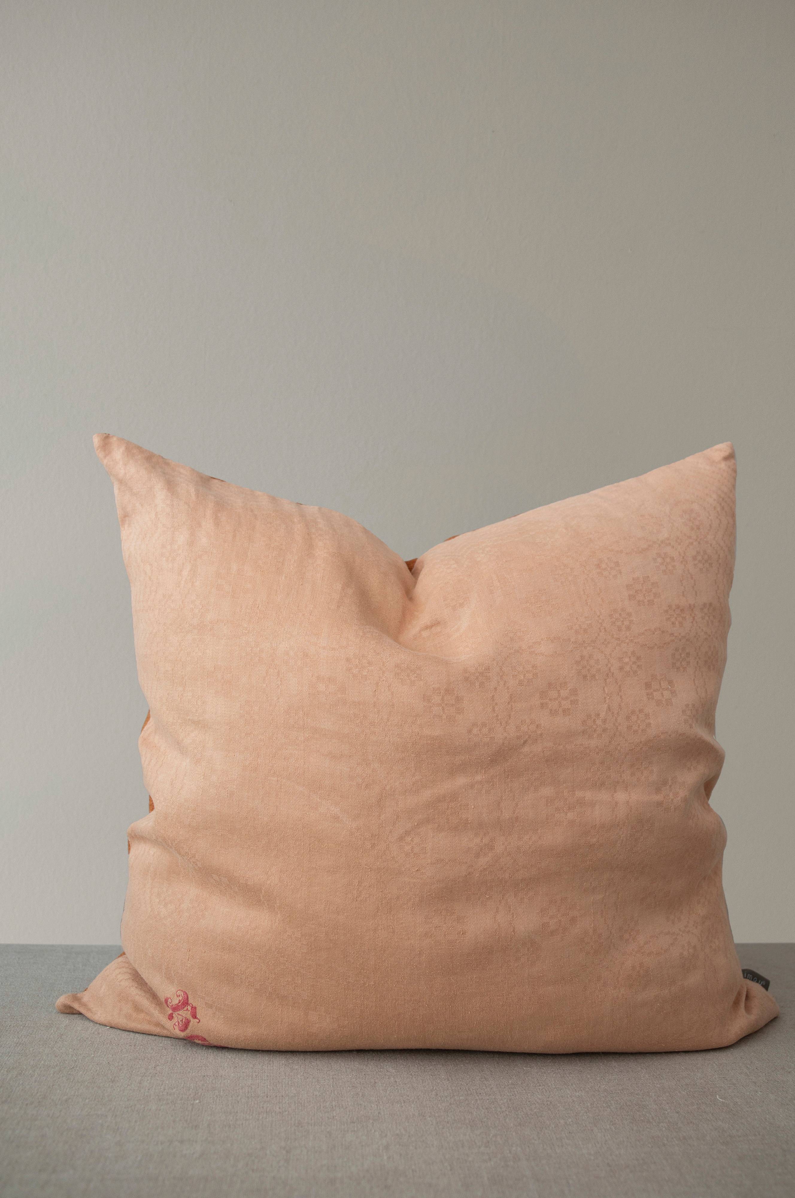 Pude med forside af ældre linnedhåndklæder, der er blevet rødfarvet med GOTS-certificeretfarvepigment i Sverige, bagside af overskudsstof. Genbrug af materialer i stedet for ny produktion er et mere bæredygtigt valg og et skridt til at reducere tekstilspild. Mønstret forside og ensfarvet bagside. Puderne varierer i udseende og farvenuance, og der kan forekomme mindre kosmetiske fejl i produktet. Puderne bliver syet lokalt i Sverige. Sælges inklusiv en velfyldt monteringspude med andefjer, der er Oeko-Tex® certificeret.