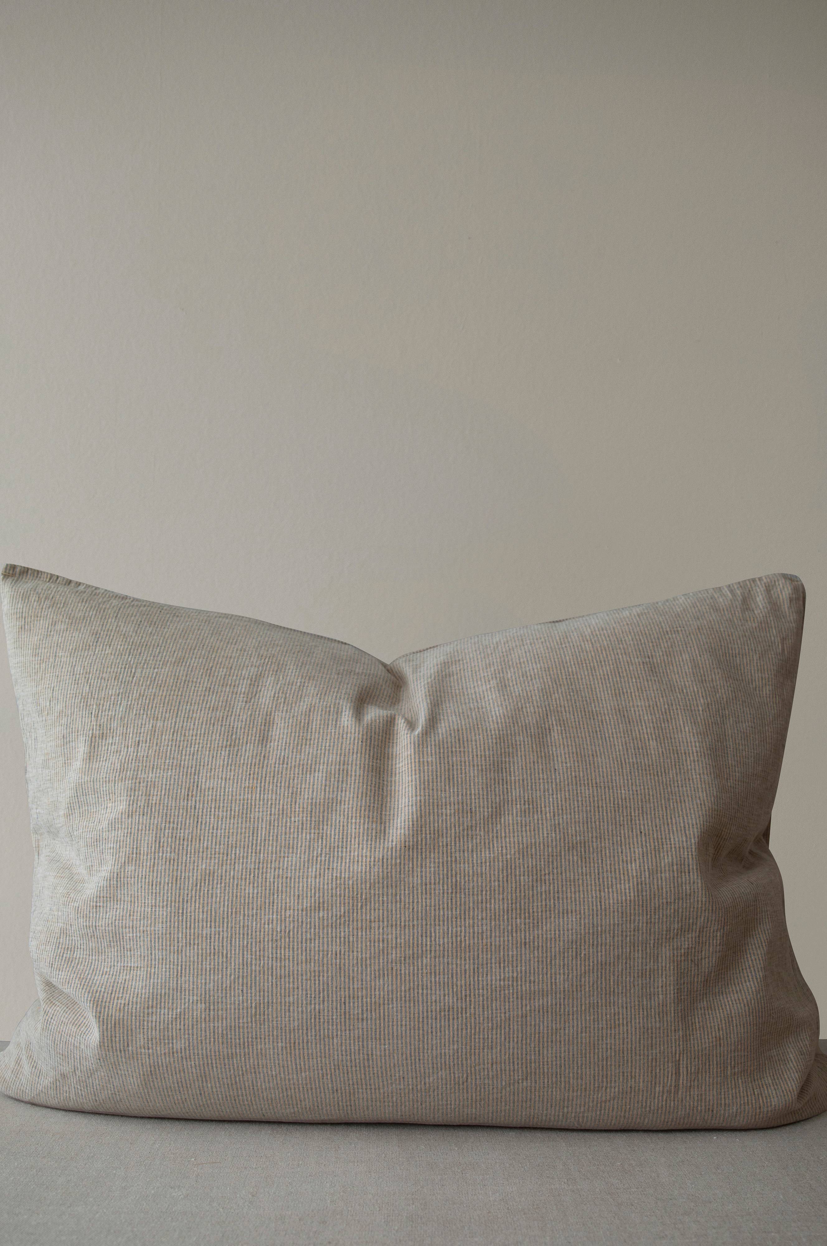 Smalstribet pudebetræk vævet af hamp og bomuld i en skøn farvekombination af natur og lyseblå. På afstand opfattes den tynde stribe næsten som en ensfarvet overflade. Pudebetrækket er køligt og luftigt at sove i og transporterer fugt væk. Pudebetrækket er også flot som en stor pyntepude i sofaen eller lænestolen. Den store størrelse passer perfekt som en ekstra sengegavl eller som gulvpude. Vores bedste tip er at bruge etuiet som opbevaring til dine ekstra tæpper i stedet for at købe en inderpude. Fold din dyne to gange, så passer den perfekt som fyld i etuiet. Hvis dine dyner er tynde, kan du fylde pudebetrækket med flere dyner. Du er velkommen til at kombinere med de andre striber og størrelser i kollektionen. Mimous sengetøj fremstilles på en af Portugals ældste familieejede fabrikker, som har været i drift i over 100 år. Stofferne er vævet af hamp og bomuld. Vi har valgt hamp på grund af dens fantastiske egenskaber. Hampplanten vokser hurtigt, hvilket betyder, at ukrudtet kvæles og derfor ikke behøver gødning og kun sparsomt med vand. Plantens dybe rodsystem binder jorden, og hampen tilfører næringsstoffer til jorden, så markerne kan bruges til dyrkning i flere år. Mængden af fibre, du får pr. dyrket hektar jord, er en af de højeste blandt alle naturlige fibre. Hamp er også en af de stærkeste og mest holdbare af alle naturfibre med lignende egenskaber som hør. Stof vævet af hamp er køligt i varmt vejr og holder på varmen i koldere vejr. Derudover har fiberen en god sugeevne, bliver blødere for hver vask og krøller ikke så let som hør.