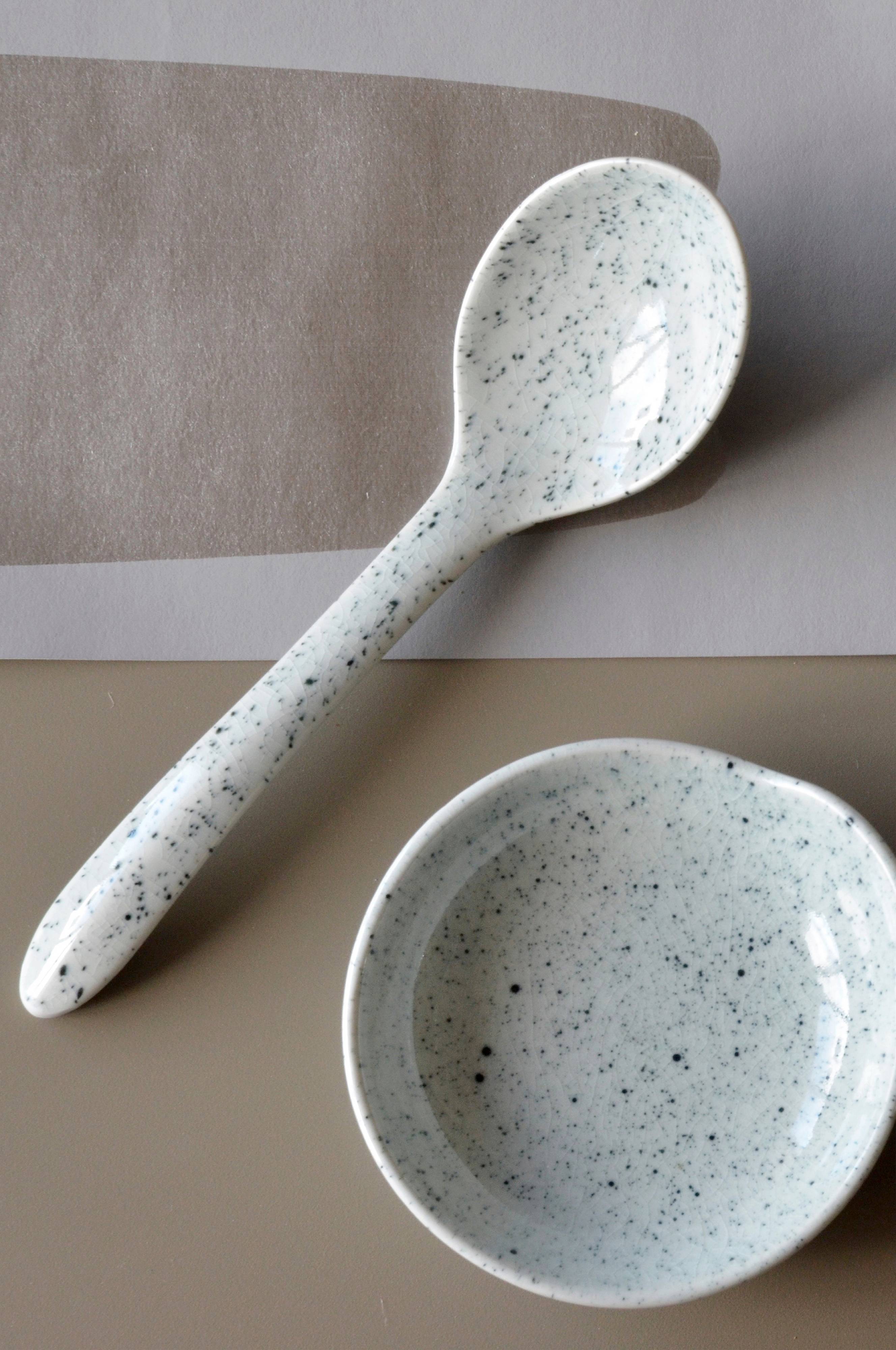 Smuk serveringsske af keramik som er støbt i hånden. Den er glaseret med celadonglasur, hvis karakteristiske træk er dets fine krakeleringer, smukke farvenuancer og hårde overflade. Det blå stænkmønster varierer mellem de forskellige servicedele, da stænkene påføres i hånden. Mimous keramik PURE er en serie af servicedele, som er fremstillet i Lampang i det nordlige Thailand. Området er kendt for sit naturligt fine ler med højt kaolindhold, hvilket gør keramikken virkelig holdbar. Hver del støbes i håndlavede forme og glaseres derefter med en af Mimous glasurer. PURE-servicet støjer ikke og har en udstråling, som man ikke bliver træt af. Servicet er kendetegnet ved de flotte proportioner, som bliver solide og robuste på grund af den fine ler og de hårde glasurer. Tåler mikrobølgeovn og maskinopvask. Størrelse 22 cm.