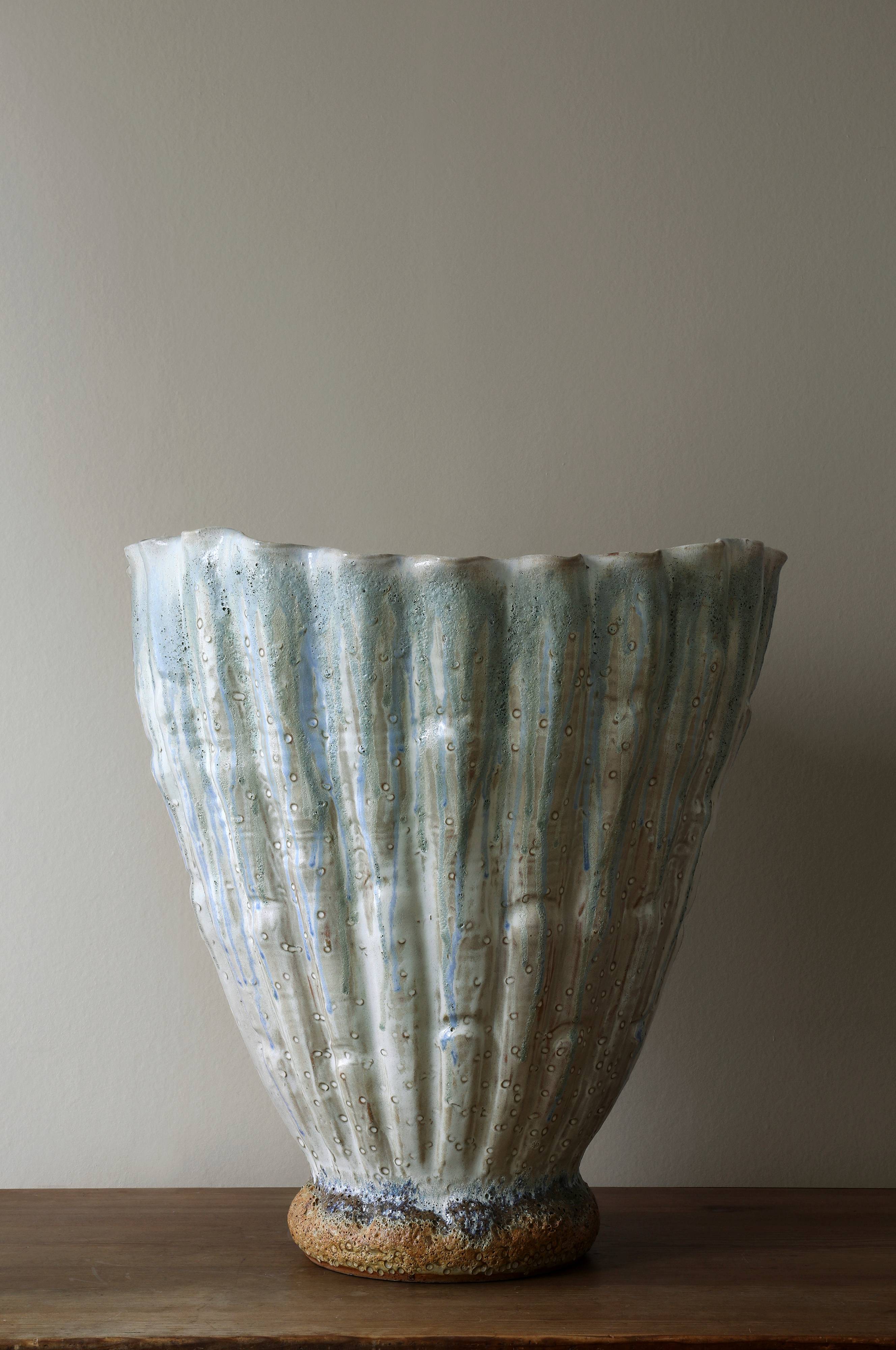 Smuk krukke som er drejet og derefter formet i hånden til sit bølgende, organiske udseende. Glasuren skifter i creme, aqua og blød blå og rose toner og er et rigtigt håndværk. Den kan bruges både inde og ude, men den er ikke frostsikker. I Thailand, hvor den er lavet, bruges krukken oftest til vandplanter, og den er lavet efter en gammel model, som ejerne af Mimou fandt uden for produktionen af deres keramik. Krukken, de fandt, havde stået der i mere end 30 år og var smukt patineret af vind og vejr. Den fungerer som gulvkrukke, som smukt blikfang på et bord eller kan vendes om og bruges som understel til et bord. Meget flot at lægge en tyk glasplade eller en stor bakke på. Højde: 60 cm. Diameter: 56 cm