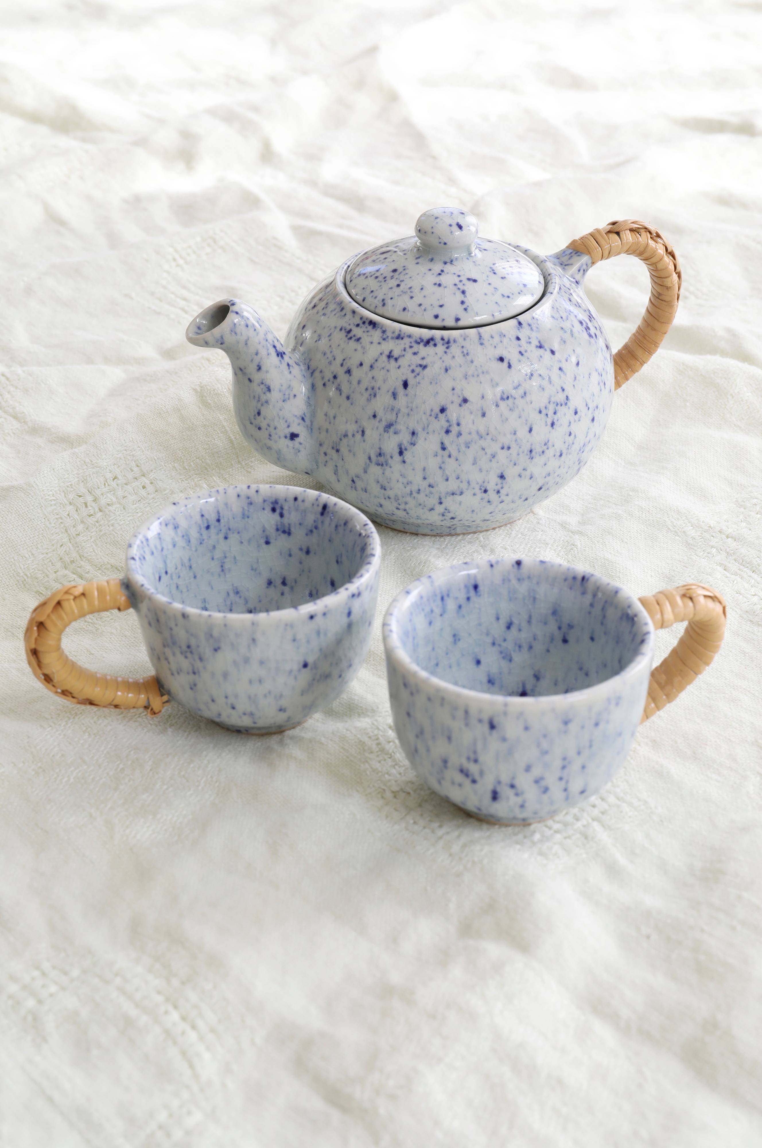 Lille keramisk tesæt, der er støbt i hånden. Håndtaget er beklædt med flettet bambus. Sættet har en glasur, der er dyppet i hånden, hvilket gør hvert stykke unikt og kan have små løb og farveskift. Minikanden og kopperne er velegnede til børn, men er også meget fine som espressokopper til voksne. Sættet indeholder 1 kande og 2 kopper. Kande: højde 10 cm, bredde 17 cm. Kop: højde 5 cm, Ø 6,5 cm.