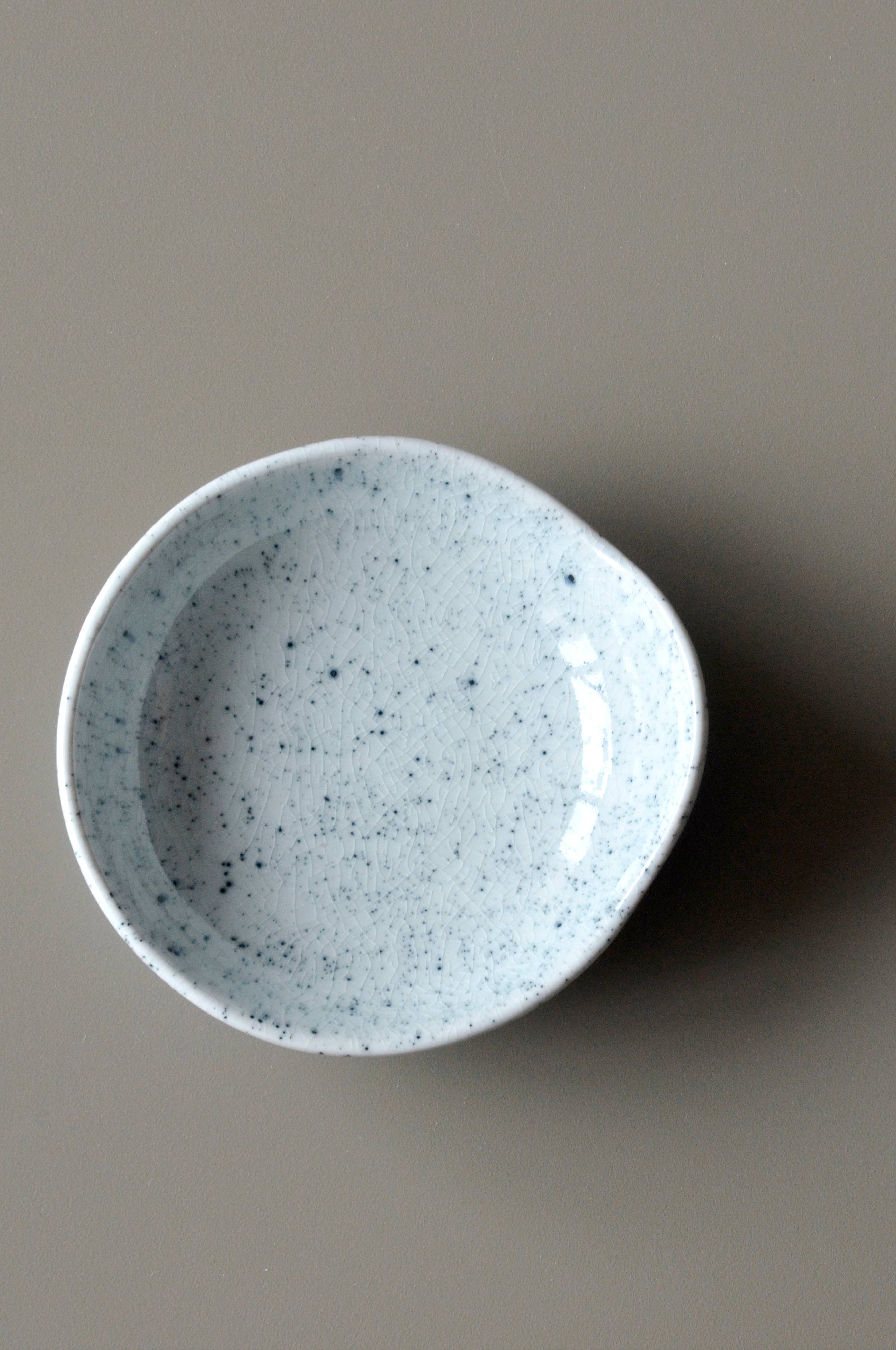 Lille skål i keramik som er støbt i hånden. Den er glaseret med celadonglasur, hvis karakteristiske træk er dets fine krakeleringer, smukke farvenuancer og hårde overflade. Det blå stænkmønster varierer mellem de forskellige servicedele, da stænkene påføres i hånden. Skålen er lige så fin til opbevaring af smykker på natbordet, som til at servere forretten i. Er også udmærket som serveringsskål til oliven, jordnødder m.m. Mimous keramik PURE er en serie servicedele, som er fremstillet i Lampang i det nordlige Thailand. Området er kendt for sit naturligt fine ler med højt kaolindhold, hvilket gør keramikken virkelig holdbar. Hver del støbes i håndlavede forme og glaseres derefter med en af Mimous glasurer. PURE-servicet støjer ikke og har en udstråling, som man ikke bliver træt af. Servicet er kendetegnet ved de flotte proportioner, som bliver solide og robuste på grund af den fine ler og de hårde glasurer. Denne matte glasur kan være følsom for hård behandling, men undgår man at skære hårdt med kniven i den eller at bruge håndmikseren i skålene, så ældes de med ynde. Tåler mikrobølgeovn og maskinopvask. Størrelse 10 cm
