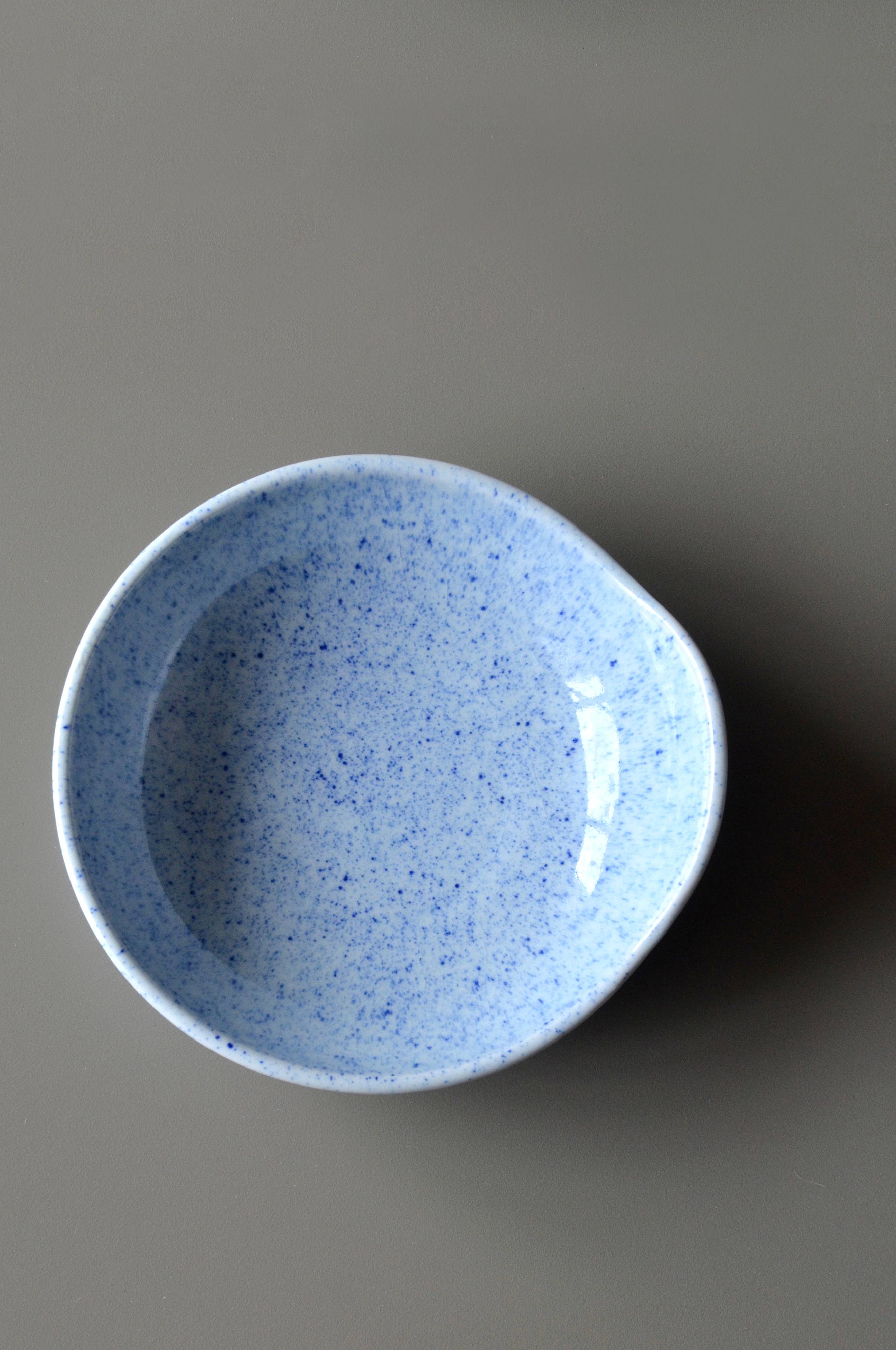 Skål i keramik som er støbt i hånden. Skålen har et finkornet stænkmønster, der har fået en sløret karakter af celadonglasuren. Stænkmalingen er lavet i hånden med specialskårne børster og derefter glaseret i klassisk celadon, der giver fine detaljer i stænkningen samt en svagt krakeleret overflade, der er meget hård og holdbar. Det sorte stænkmønster kan variere på de forskellige servicedele. Størrelsen passer perfekt til opbevaring af smykker på natbordet eller til at servere forretten i. Er også udmærket som serveringsskål til oliven, jordnødder m.m. Mimous keramik PURE er en serie servicedele, som er fremstillet i Lampang i det nordlige Thailand. Området er kendt for sit naturligt fine ler med højt kaolindhold, hvilket gør keramikken virkelig holdbar. Hver del støbes i håndlavede forme og glaseres derefter med en af Mimous glasurer. PURE-servicet støjer ikke og har en udstråling, som man ikke bliver træt af. Servicet er kendetegnet ved de flotte proportioner, som bliver solide og robuste på grund af den fine ler og de hårde glasurer. Tåler mikrobølgeovn og maskinopvask. Størrelse 16 cm