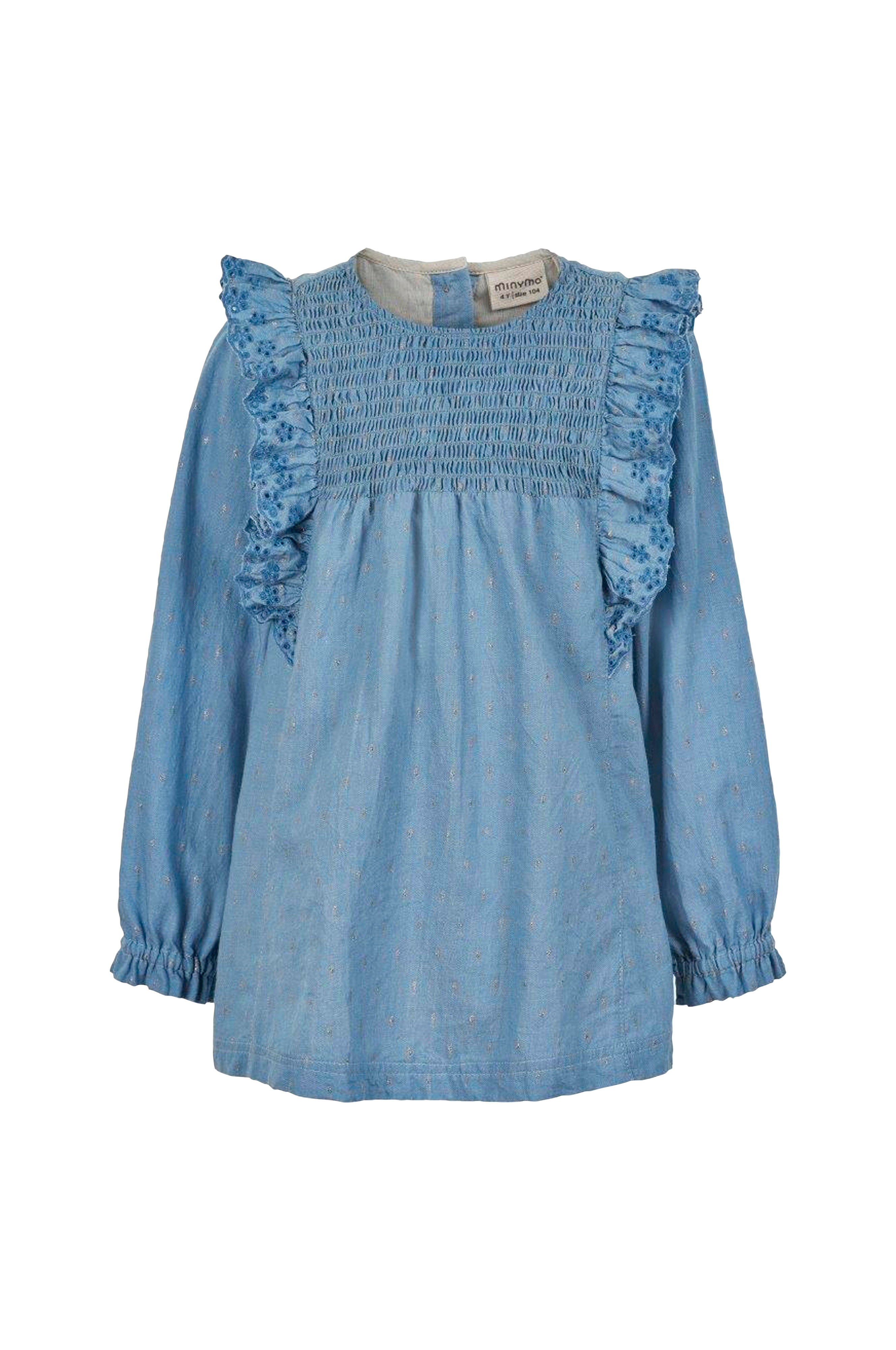 • A-linje design• Smock oppe foran• Lange ærmer med elastiske manchetter• Volanter over skuldrene• Tyndt for