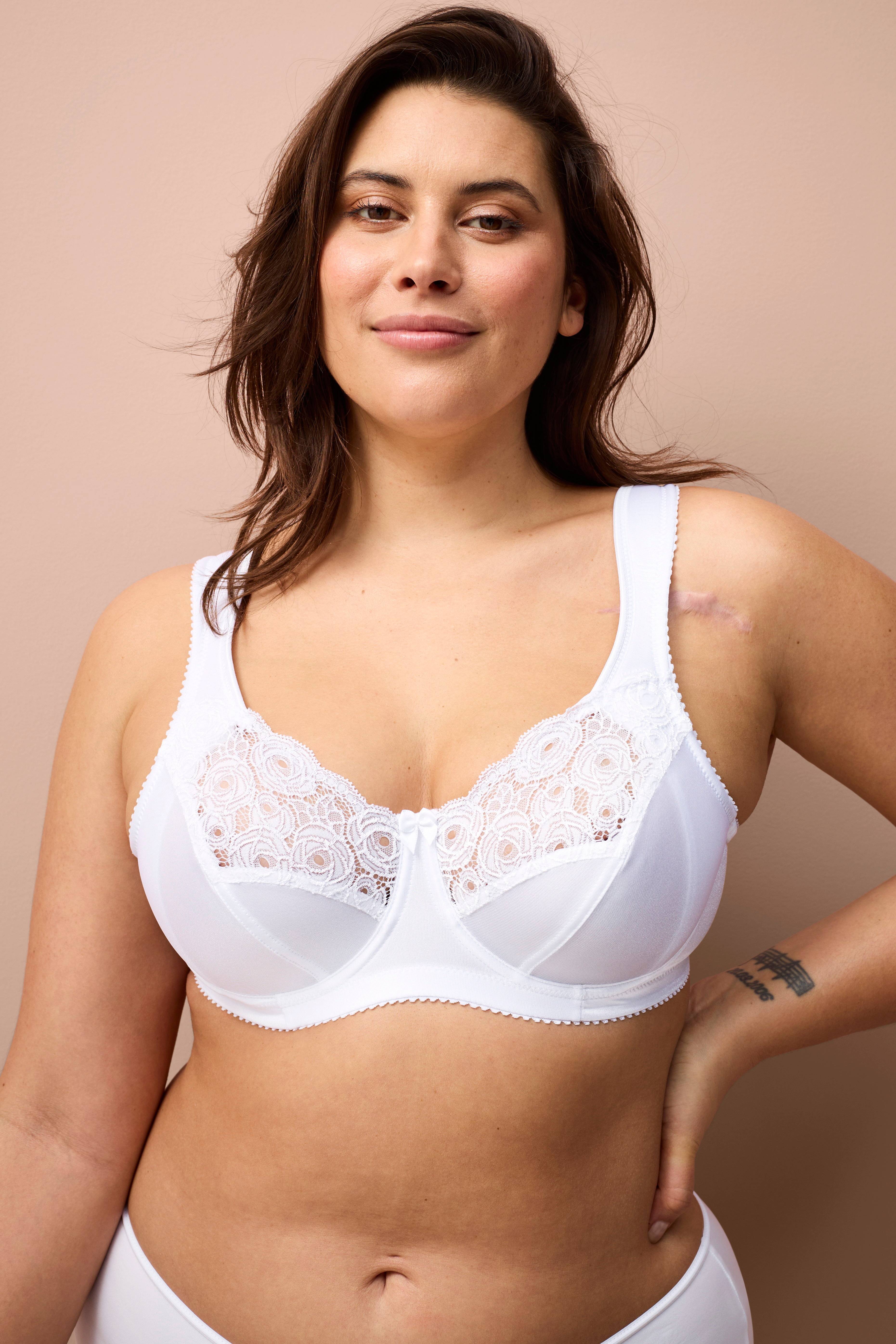 Stabil bøjle-bh i flot design med gennembrudt blonde. Stabil model med 3-delt skål som er vatteret og giver en rund, fin barm og behageligt støtte. Aflastende brede, vatterede skulderstropper som er regulerbare bagpå.