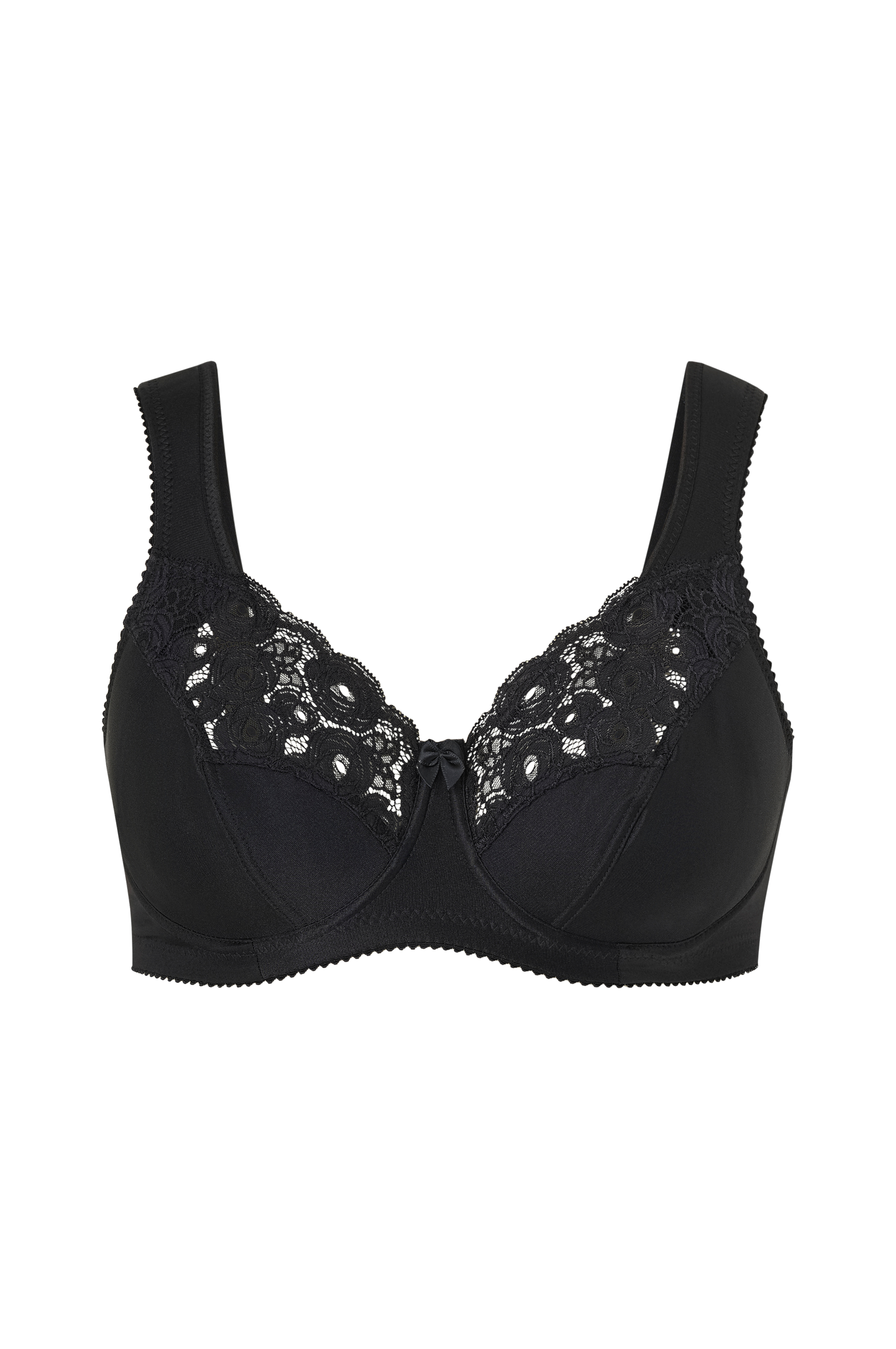 Stabil bøjle-bh i flot design med gennembrudt blonde. Stabil model med 3-delt skål som er vatteret og giver en rund, fin barm og behageligt støtte. Aflastende brede, vatterede skulderstropper som er regulerbare bagpå.