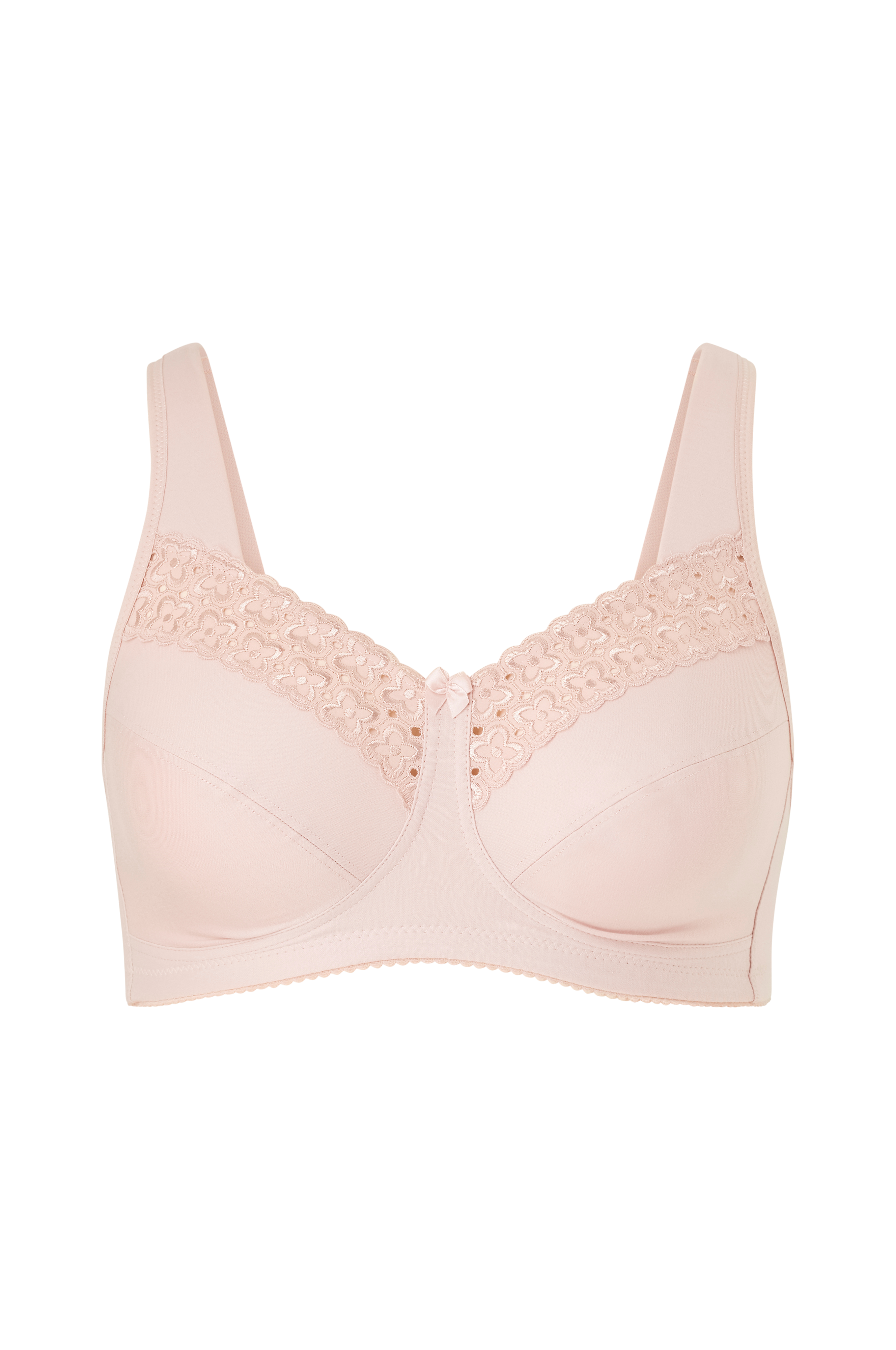 Eksklusivt bomuldsmateriale der giver et ekstra blødt touch. Skålene giver stabil støtte. Elegant broderibånd. Brede vatterede skulderstropper. Dejlig ryg af bomuld/elastan med justerbar hægte/mallelukning. 83% bomuld, 10% elastan, 7% polyamid. Vask 40°.
