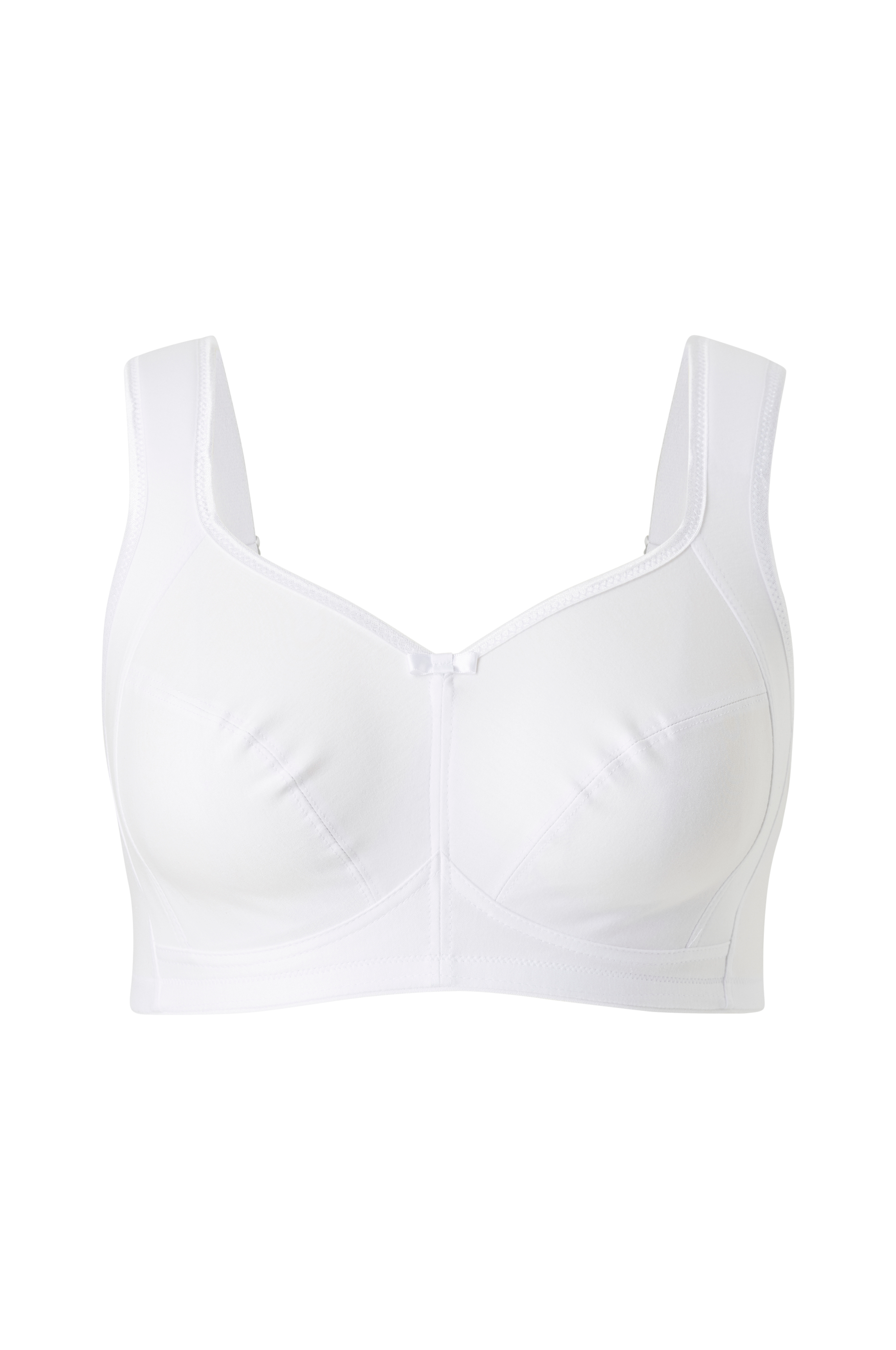 Bøjlefri bh med smart lomme, der effektivt adskiller og former barmen. Ekstra stof under brystet for at hjælpe dem, der har problemer med irritation på huden mellem bryst og mave. Fremstillet af blødt bomuld, som er åndbart, skånsomt mod huden og behageligt at have på hele dagen. Den runde skålform og de flade, syede sømme giver et glat look, der ikke er synligt under tøjet.