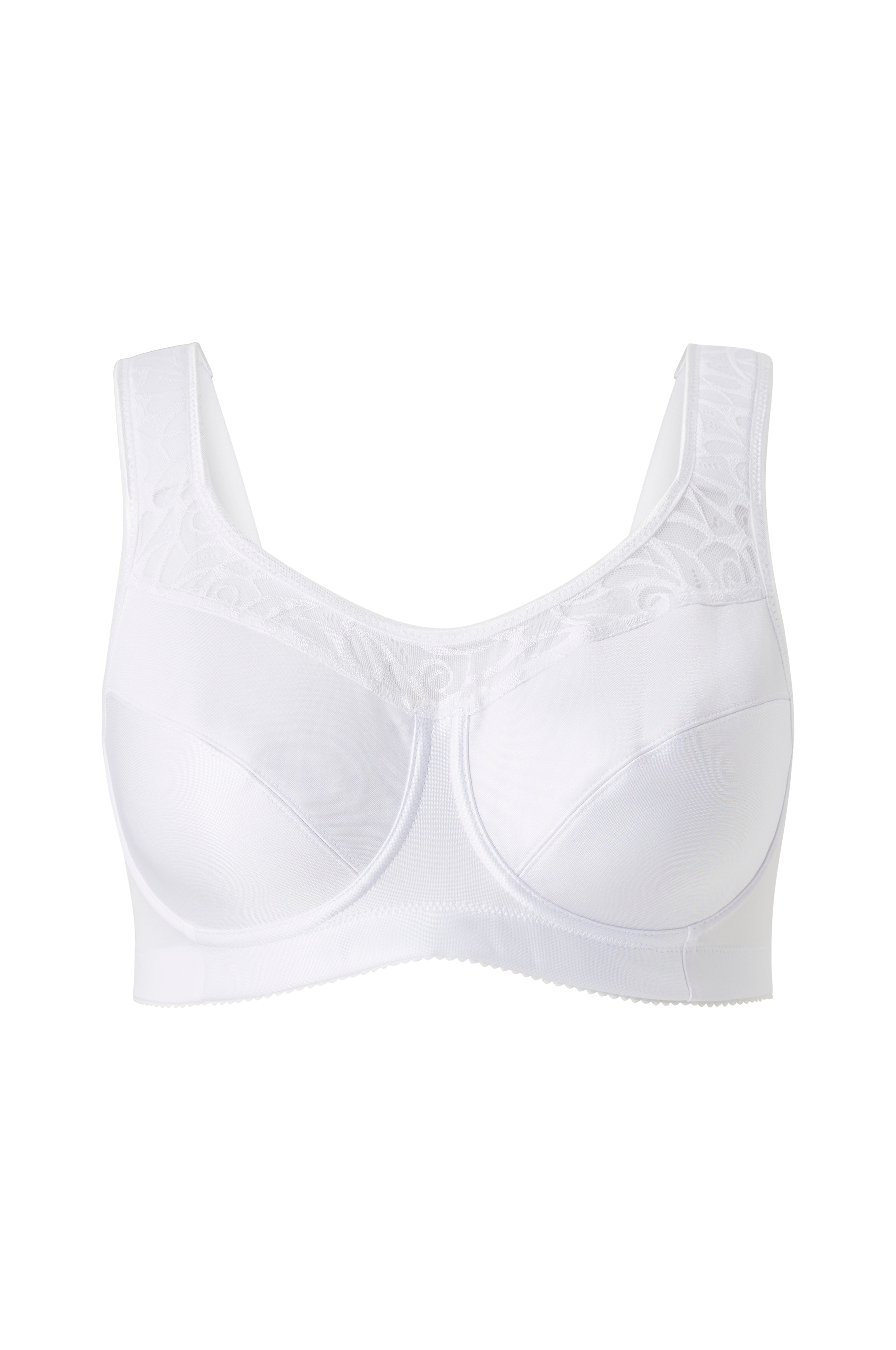 Simplex-bøjle-bh i bomuld, som giver fremragende støtte og løft. Ekstra høj halsudskæring med mønstrede mesh-detaljer. Et sporty look, der passer til alle aldre. Skål og front i eksklusivt simplex-materiale med blank yderside og blød bomuld indeni. Upolstret, ekstra højt skåret helskål i fuldskummateriale. Flade, diskrete skålsømme, som ikke er synlige under tøjet. Eksklusivt lamineret materiale med blød bomuld på indersiden.