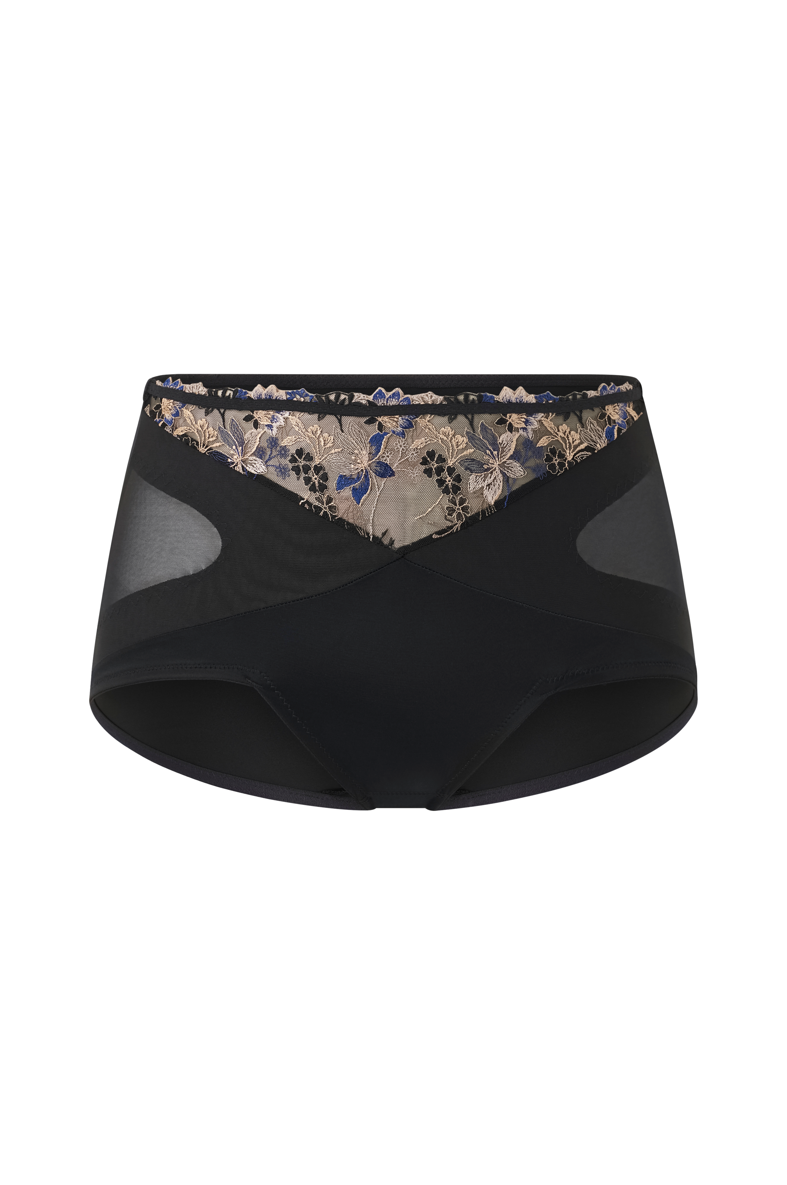 Eksklusiv trusse med glitrende broderi. Designet af den svenske couture-mester Lars Wallin i et eksklusivt samarbejde med Miss Mary. Fremstillet af blødt, elastisk materiale, som er behageligt at have på. Forstærkning foran giver støtte og har en formende effekt. V-formet benåbning foran giver øget komfort, når du bevæger dig. Glat, ensfarvet bagside og bomuldsforet skridt.