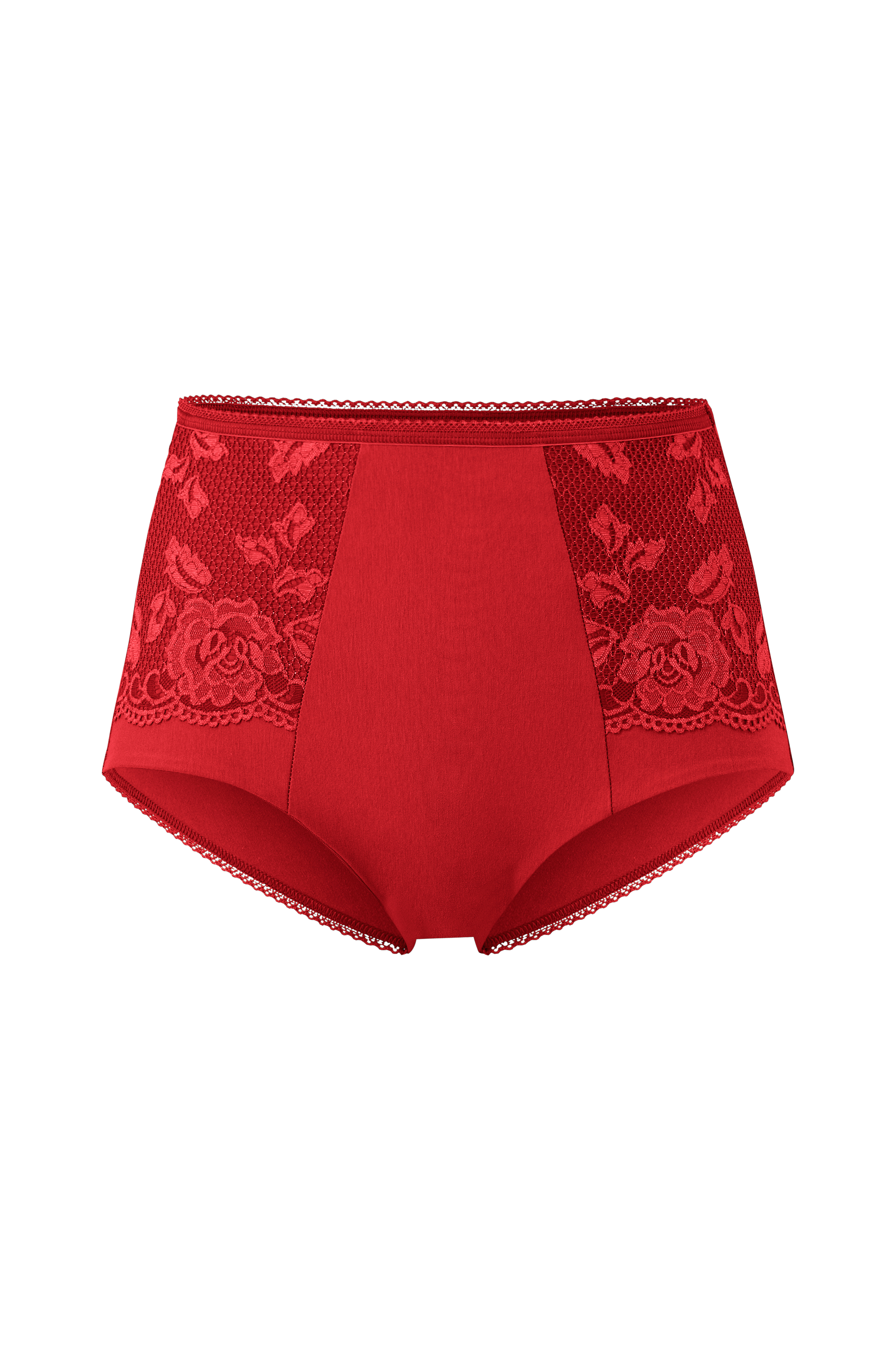 Taljehøj trusse med let formende effekt på mave og talje. Opslået front med elastisk netforing. Blød elastik i taljen og ved benåbningerne gør trusserne ekstra behagelige. Dekorative blomstermønstrede blondedetaljer i siderne. Skridtet er foret med bomuld.