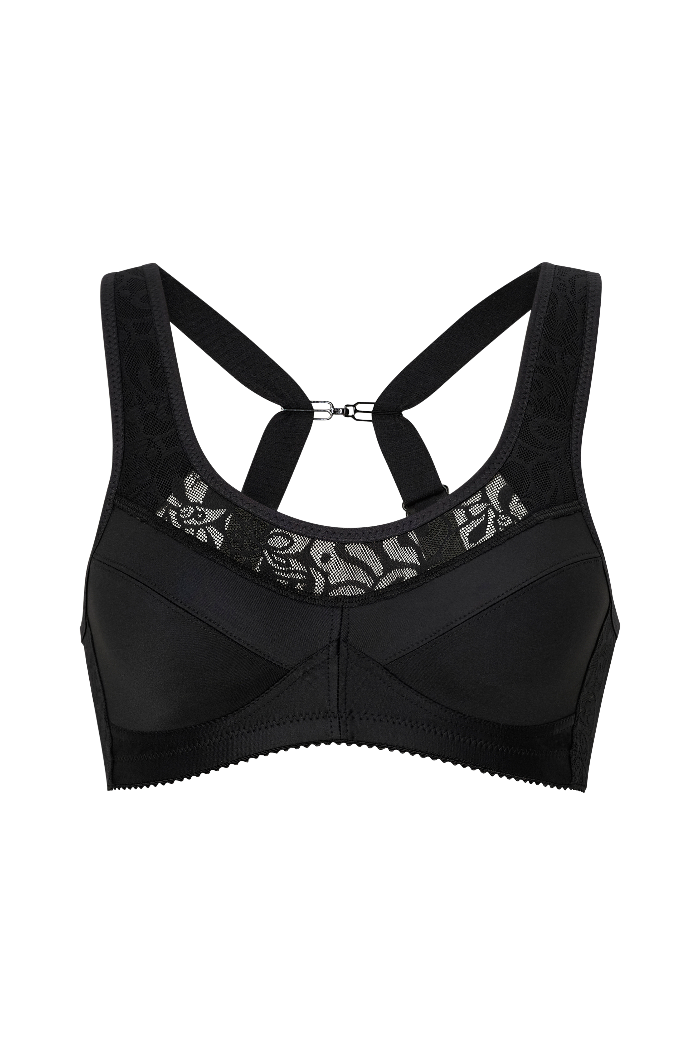 Sports-bh til lavintensiv træning. Fremstillet i Keep Fresh-materiale som lader huden ånde, er fugttransporterende og duftresistent. Skålen har dobbeltlag materiale for ekstra støtte. Dekorativ, ventilerende blonde foroven. Vatterede og justerbare skulderstropper samt hægte- og mallelukning bagpå. Skulderstropperne kan hægtes sammen til bryderryg ved behov.