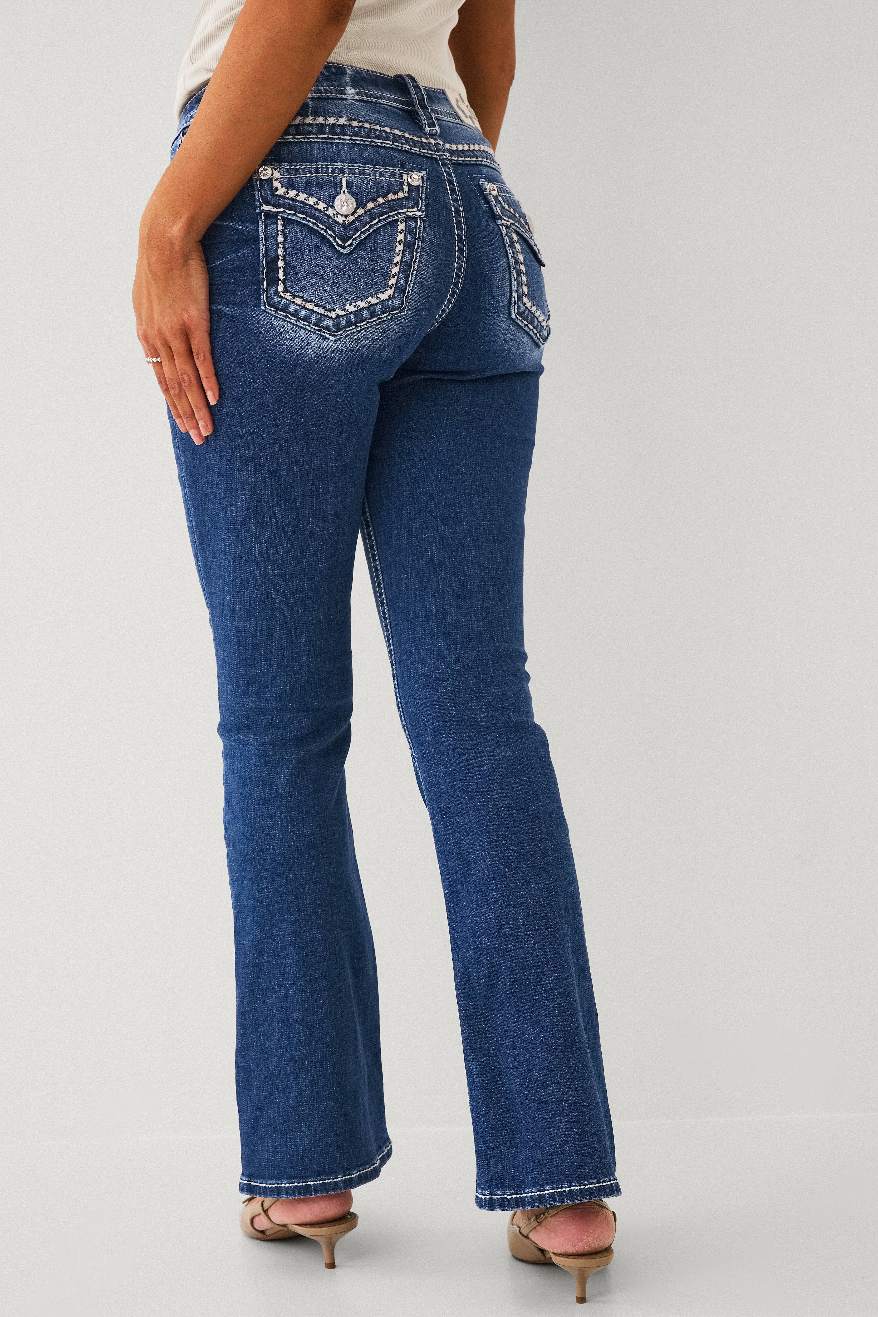 • Bootcut-model med ben med svaj• Mediumhøj talje• Smal pasform• Femlommemodel• Gylp med lynlås• Dekorerede lommer med funklende sten, dekorative syninger, nitter og glitrende tråd