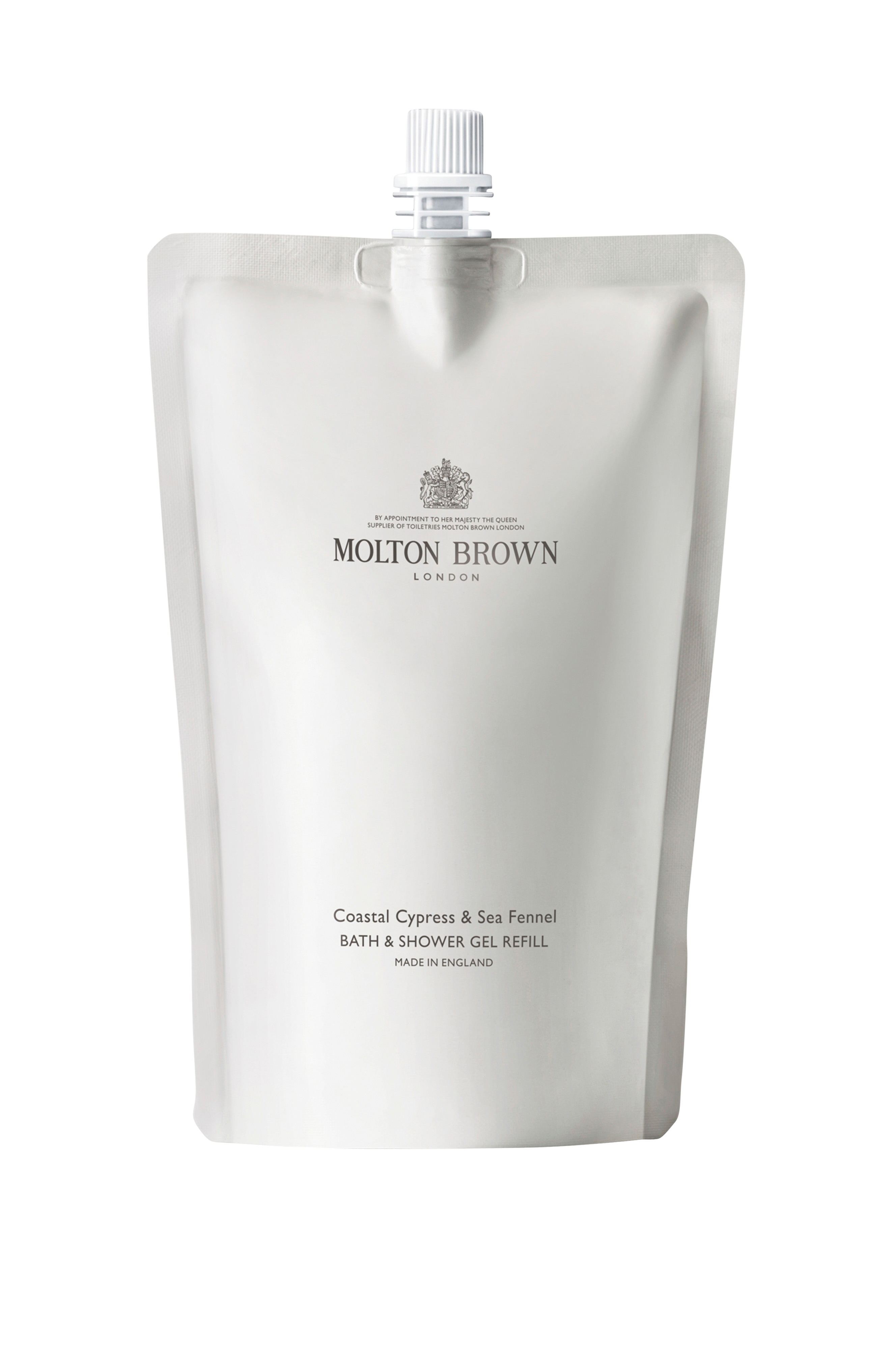 Genopfyldning. Molton Brown Coastal Cypress & Sea Fennel Bath & Shower Gel tilføjer lidt luksus til dit baderitual med en duft, der fremkalder den friske fornemmelse af en havbrise. Denne forfriskende bade- og brusegelé med marine, aromatiske noter af australsk havfennikel og saltet cypres renser huden og efterlader den delikat duftende. Denne refill-pose er lavet af 63% mindre plastik end standardflaskerne og kan bruges til at genopfylde din eksisterende Molton Brown-flaske. Brug den sammen med Molton Browns matchende Body Lotion for en komplet duftoplevelse.