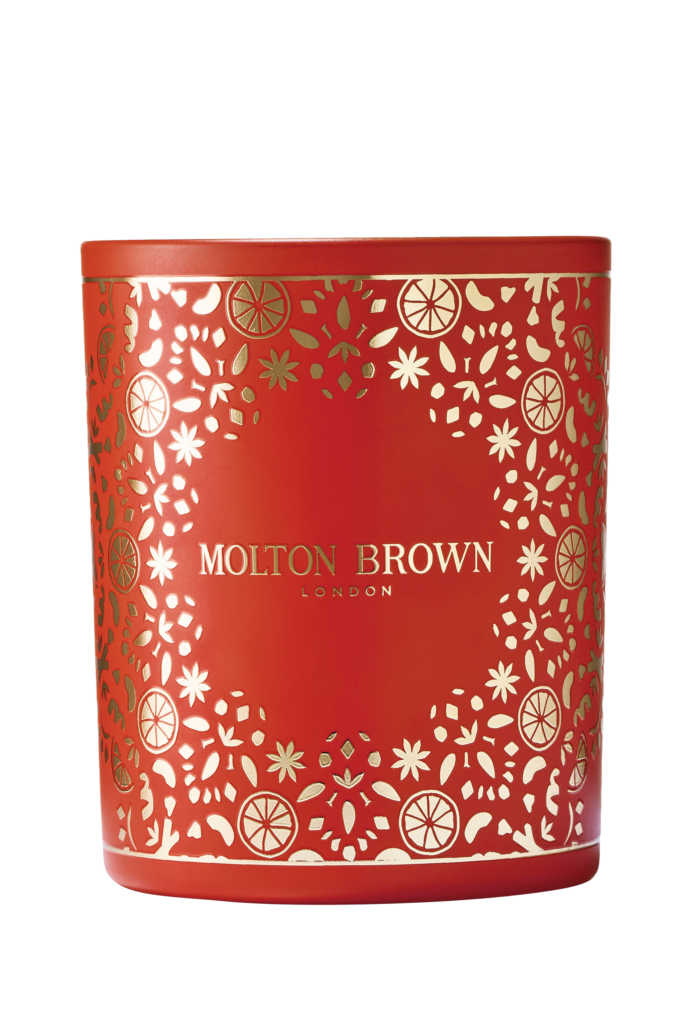 Molton Browns smukt dekorerede duftlys med guldfoliestråler med noter af livlig mandarin, stødt kanel og lækker tørret frugt.