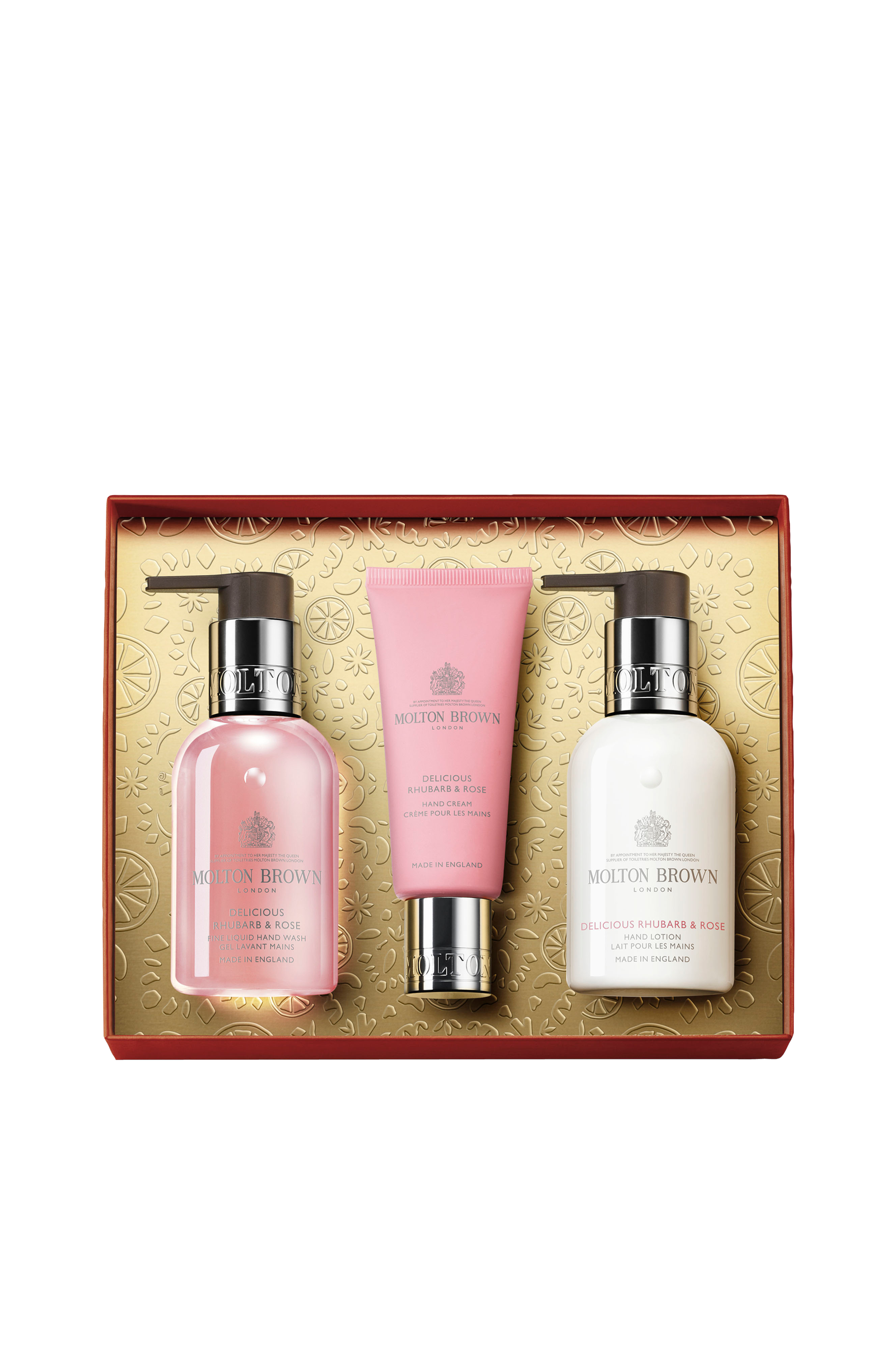 Trio fra Molton Brown med håndsæbe, lotion og creme parfumeret med grapefrugt, rabarber og vanilje.