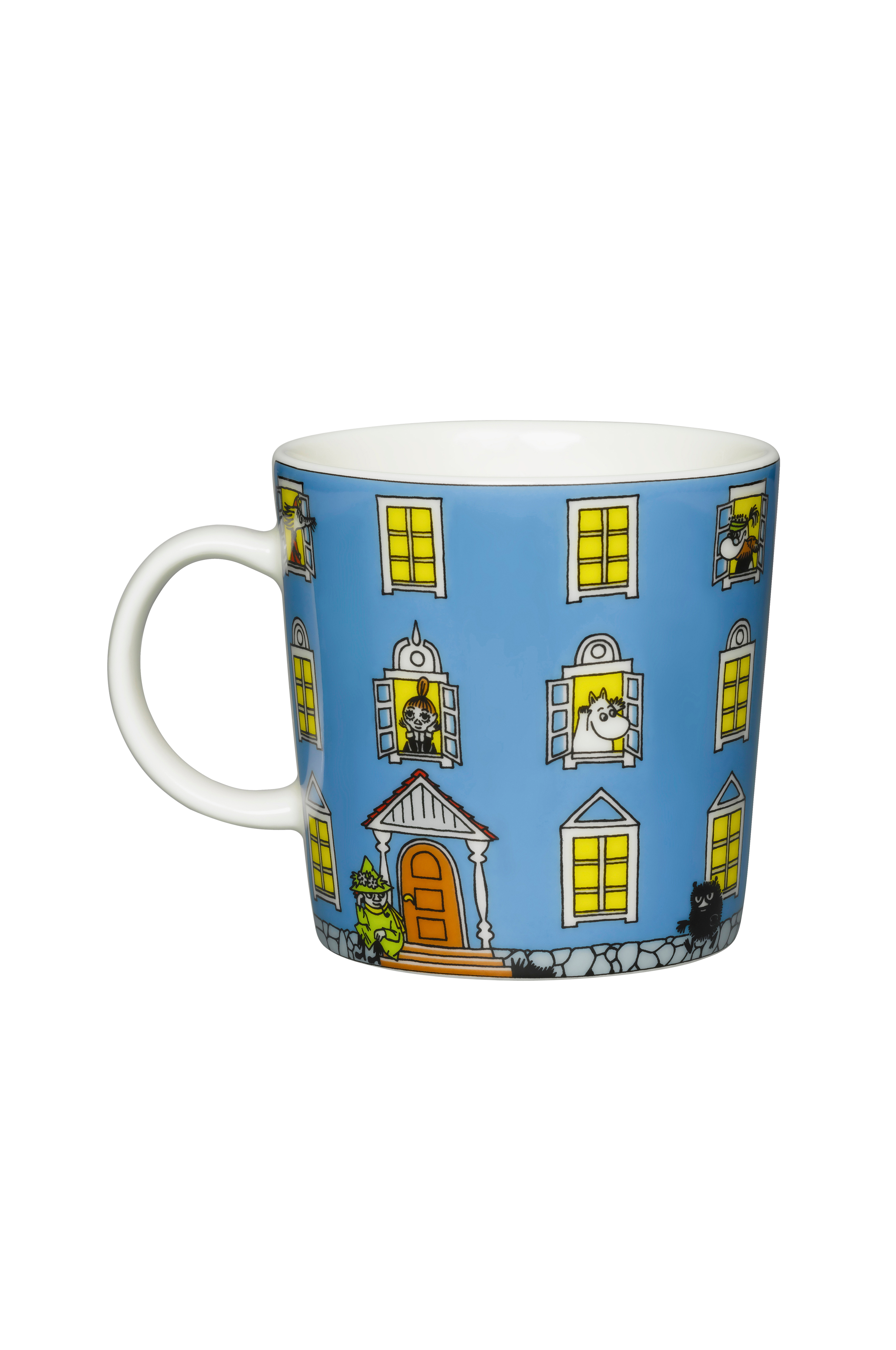 Muminpappa er meget stolt af Muminhuset, fordi han selv har bygget det. Gæster er altid velkomne, og dørene er altid åbne, også om natten. Far, mor og Mumitrolden bor i huset og er dets faste beboere. Andre kommer og går, som de vil. Moomin Arabia krus 0,3L, Muminhuset