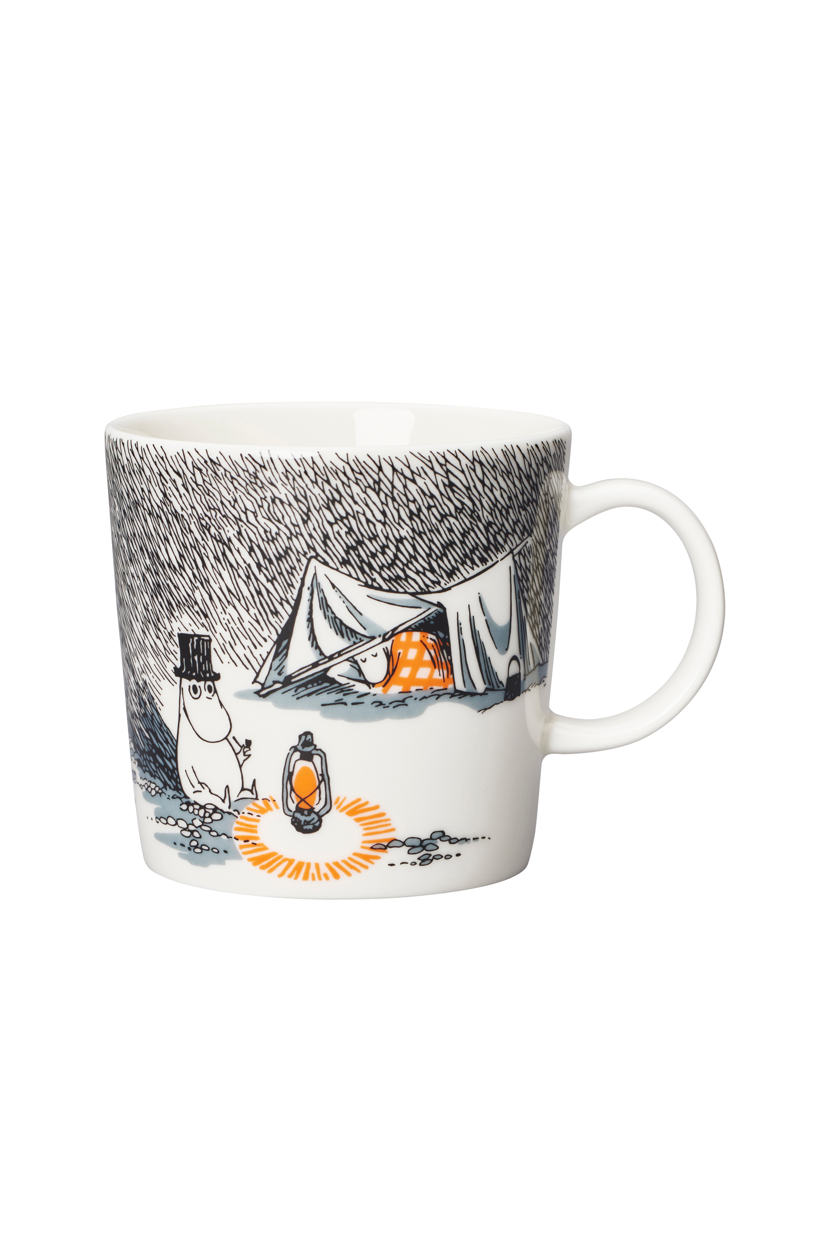 Muminpappa tager sin familie med ud at bo på en ø med et øde fyrtårn. Hans trætte familie ankommer til øen i mørke, så han sætter et telt op på stranden, hvor de kan tilbringe den første nat. Muminpappa holder sig vågen hele natten med kun havet og en orkanlampe som selskab. Moomin Arabia krus 0,3L, Sov godt