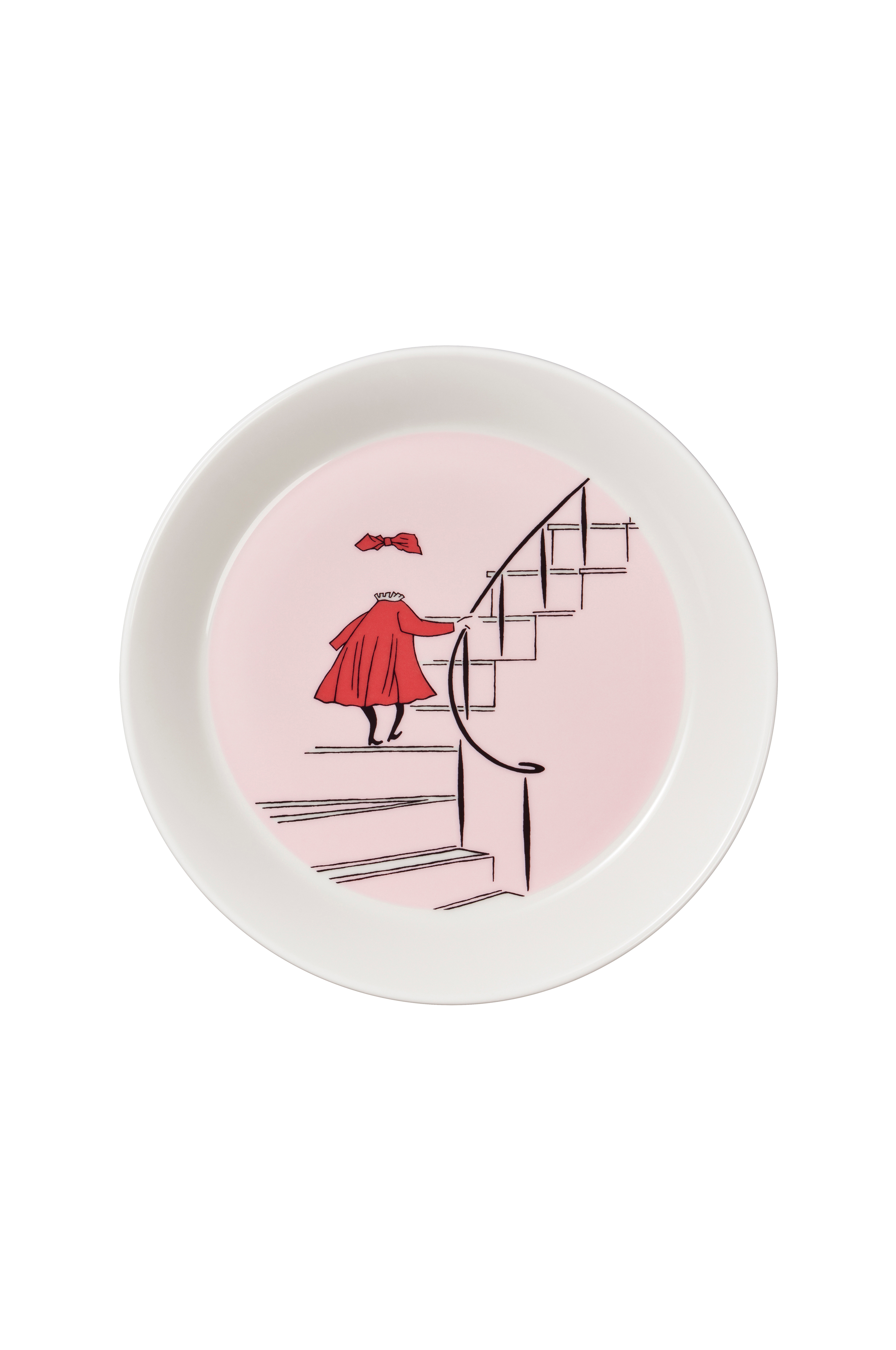 Ninny, det usynlige barn fra Muminhistorierne, er blevet usynlig på grund af dårlig behandling. Den eneste synlige del af hende er en lille sølvklokke, der hænger om hendes hals. Muminfamiliens varme, kærlige og tolerante måde at være på giver Ninni selvtilliden tilbage, og hun bliver synlig igen.Moomin Arabia-plade 19 cm, Ninny