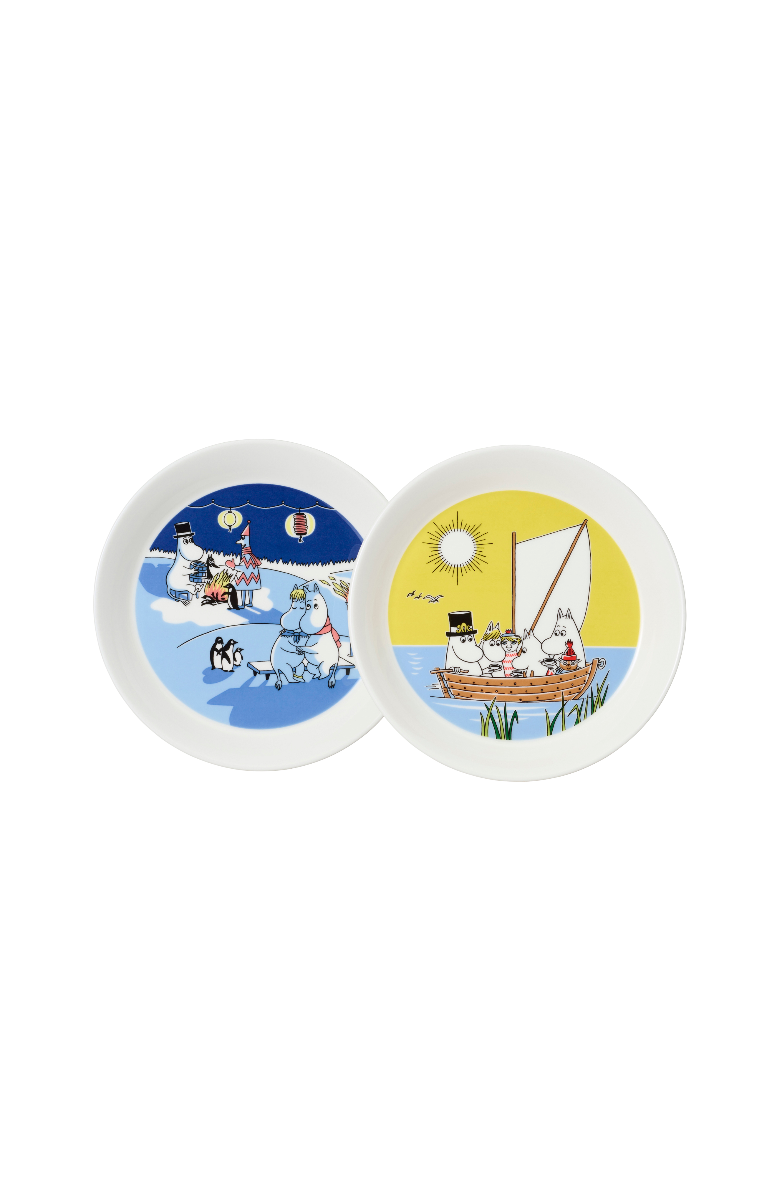 Samleplader 2024. I illustrationen Bonfire fra 2008 kæler Mumitrolden og Snorkfrøkenen for at holde hinanden varme i den kolde vinternat - en fakkel lyser op ved siden af dem. I Sailing fra 2014 tilbringer Mumitroldene en hyggelig sommerdag på båden sammen med en Nibling og Too-Ticky. Moomin Arabia, tallerkensæt 19 cm, Bonfire & Sailing
