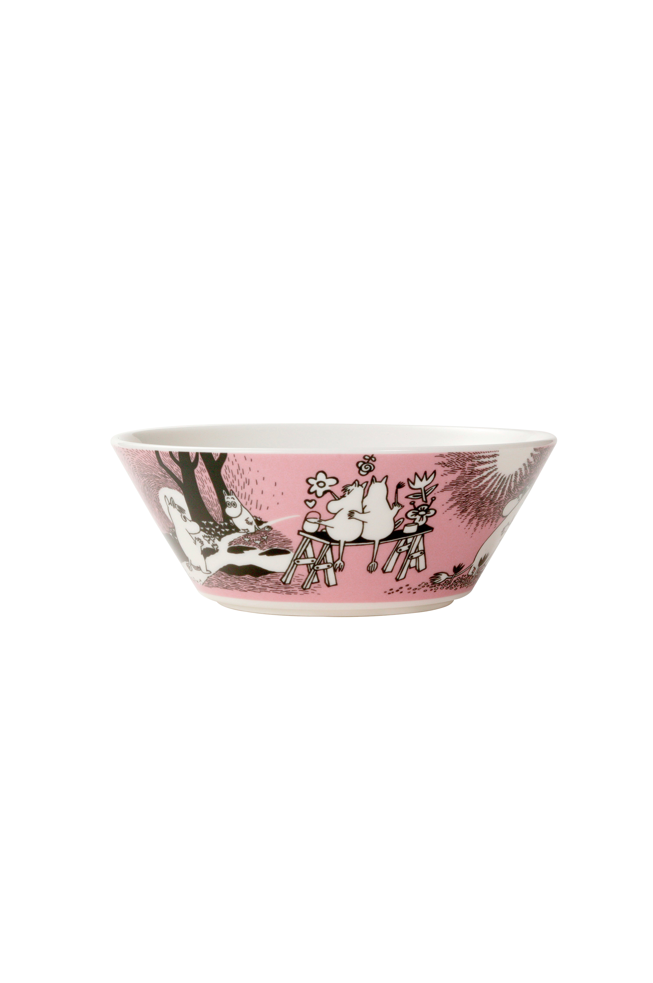 Snorkfrøkenen charmerer Mumitrolden igen og igen, selv om de begge nogle gange er forelskede i andre. Snorkfrøkenen vil gerne reddes, og Mumitrolden hjælper gerne. Deres eventyr har altid en lykkelig slutning. Moomin Arabia skål 15 cm, Kærlighed