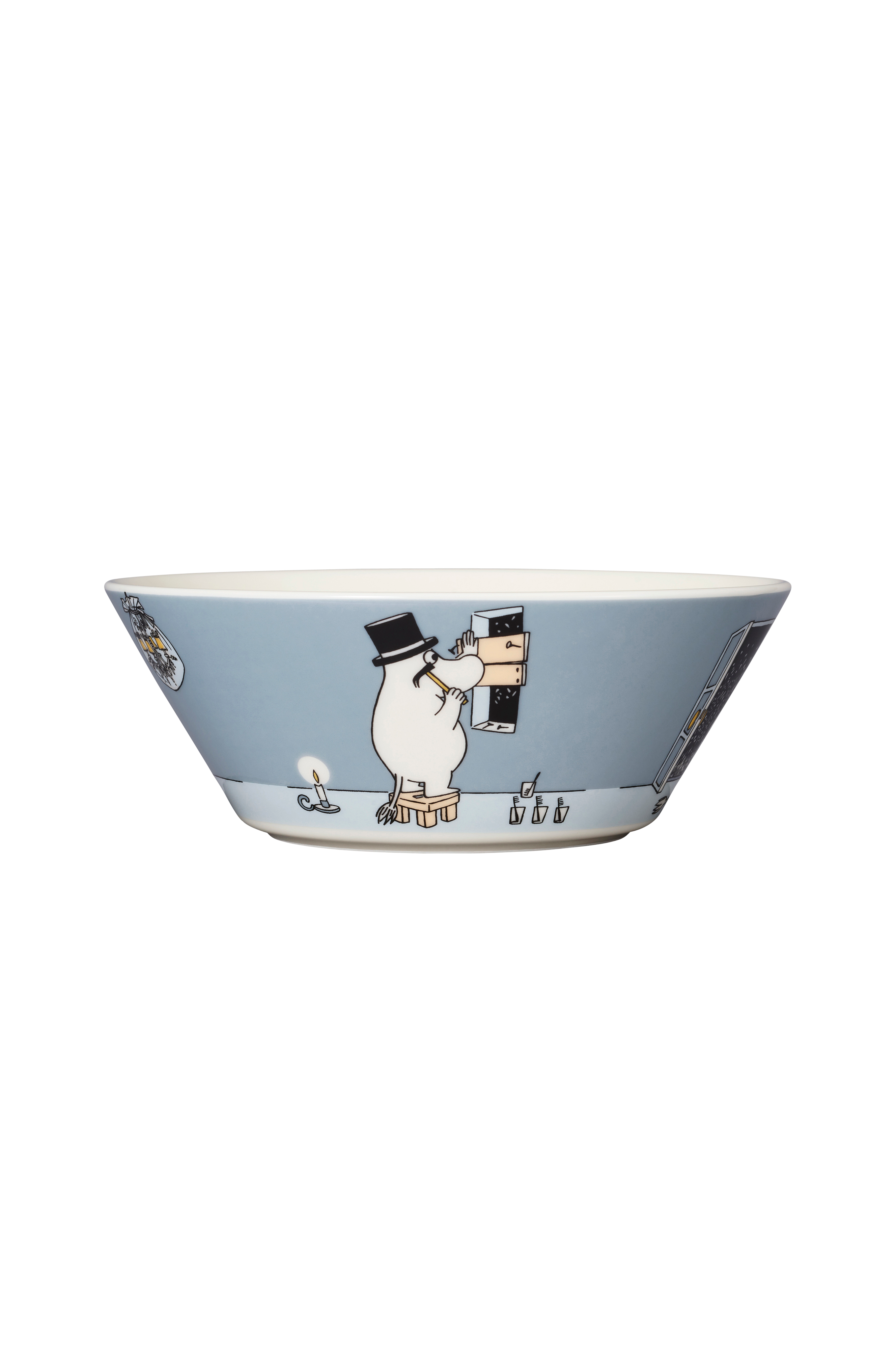 Muminpappa gør huset klar til vinteren, så familien kan holde varmen under deres vinterhi. Kulden bliver udenfor og varmen indenfor, når vinduerne er isoleret med brædder, og der er brænde nok. Mumin Arabia skål 15 cm, Muminpappa