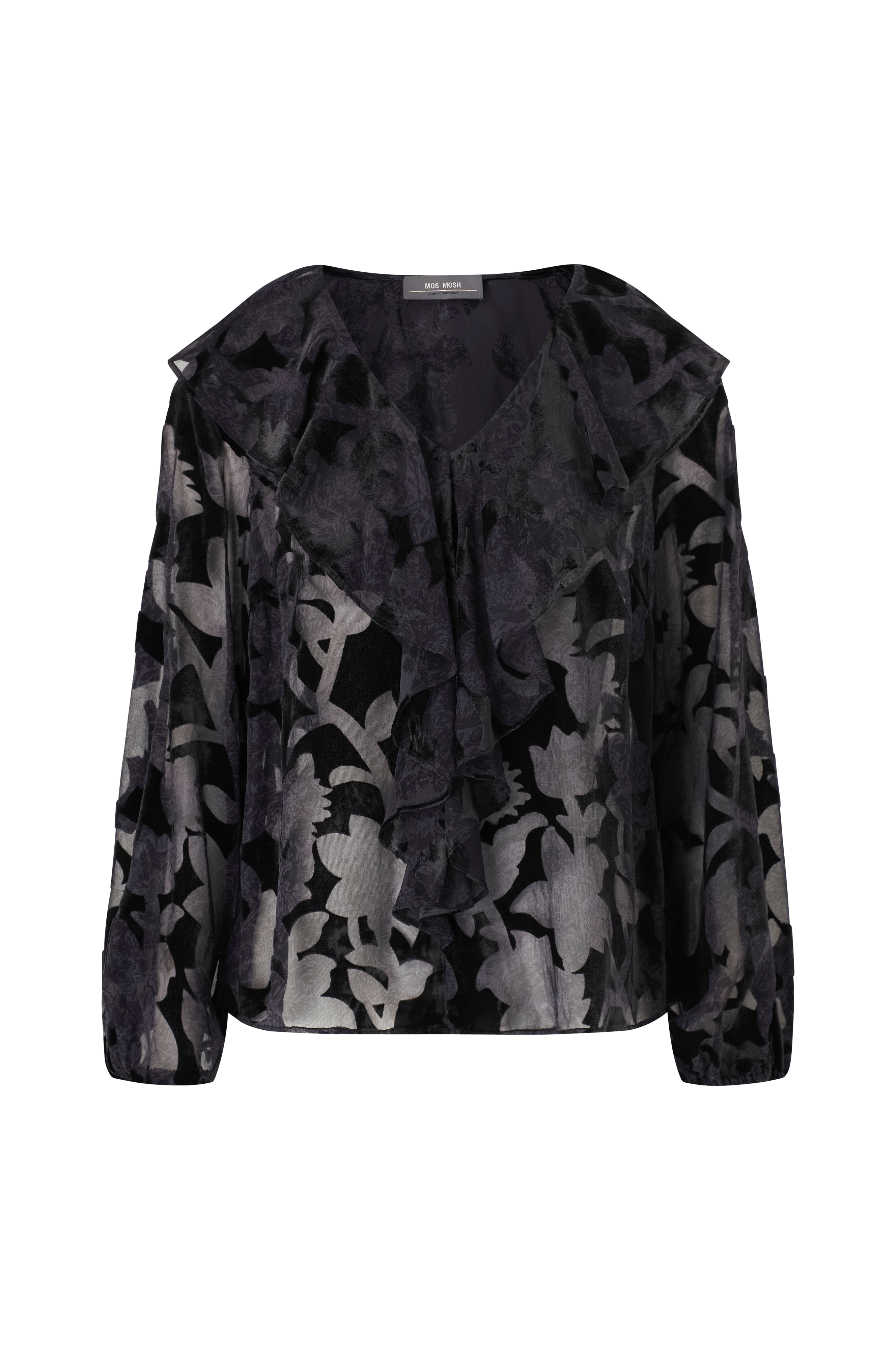 • Uformel model i chiffon med burnout-mønster• V-udskæring med bred volant hele vejen rundt• Langt, bredt ærme med elastik ved manchetterne