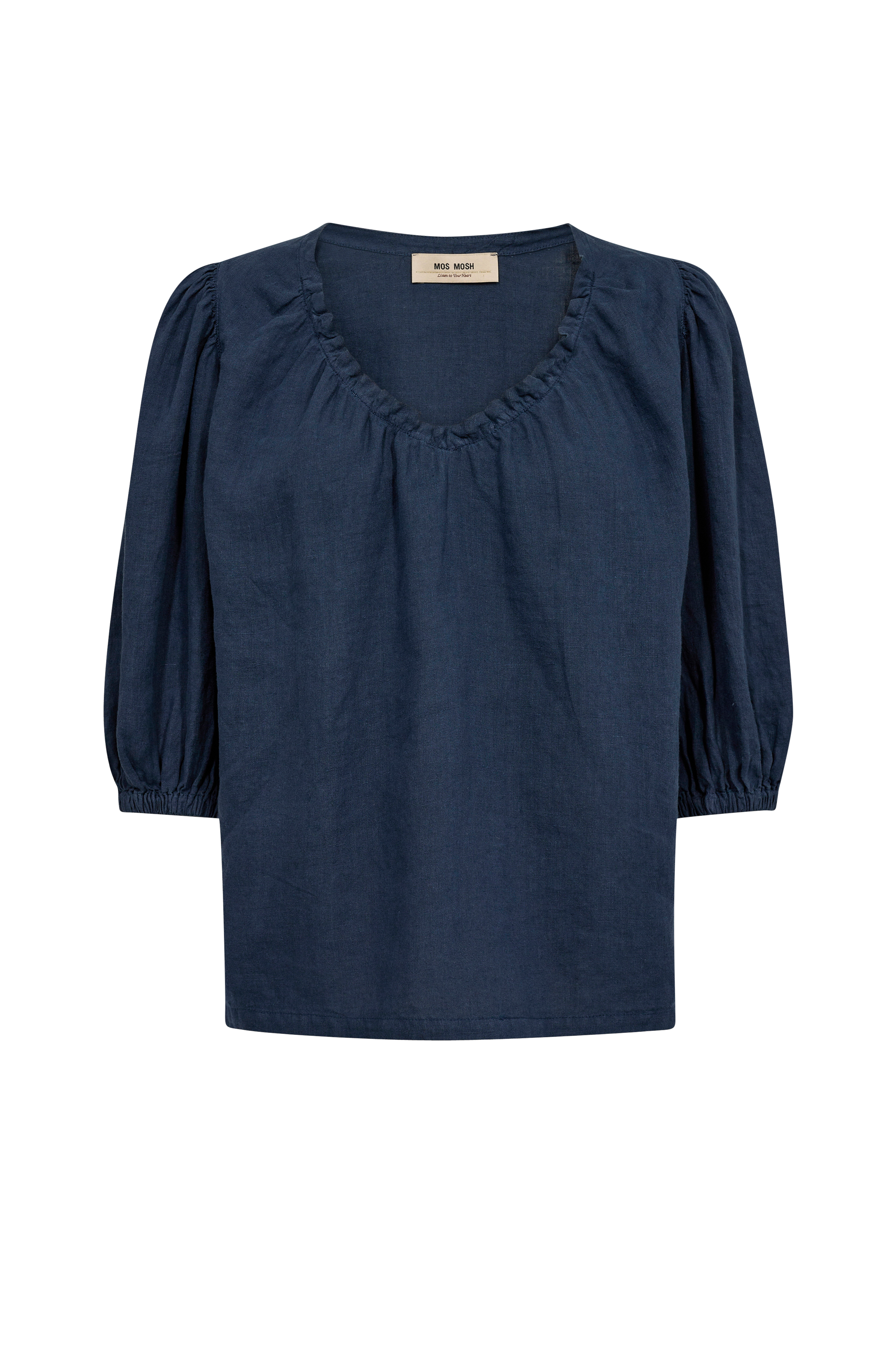 • Bluse i hør• Bred v-udskæring med volant• Halvlange ballonærmer• Samling på skuldrene