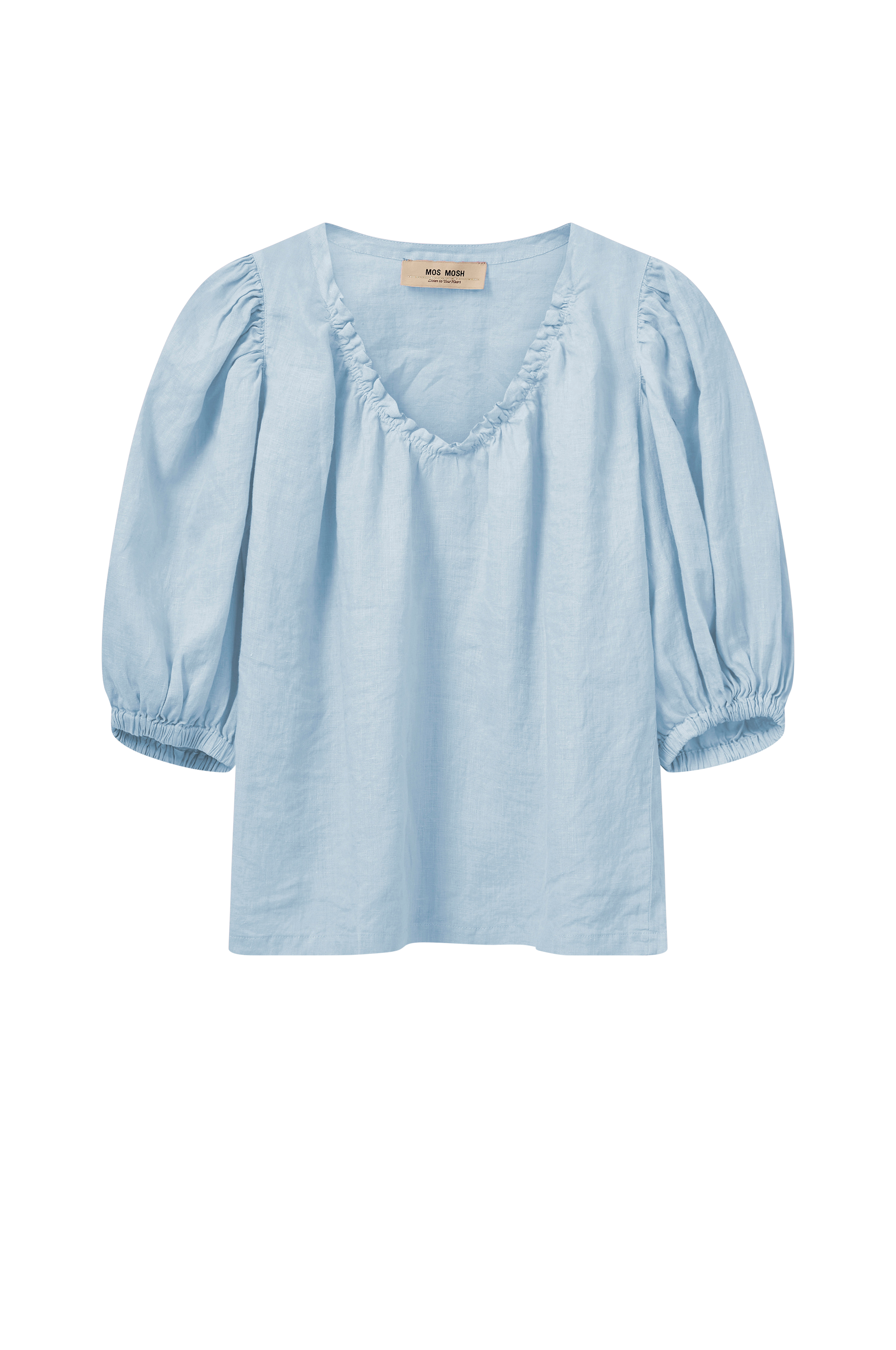 • Bluse i hør• Bred v-udskæring med volant• Halvlange ballonærmer• Samling på skuldrene