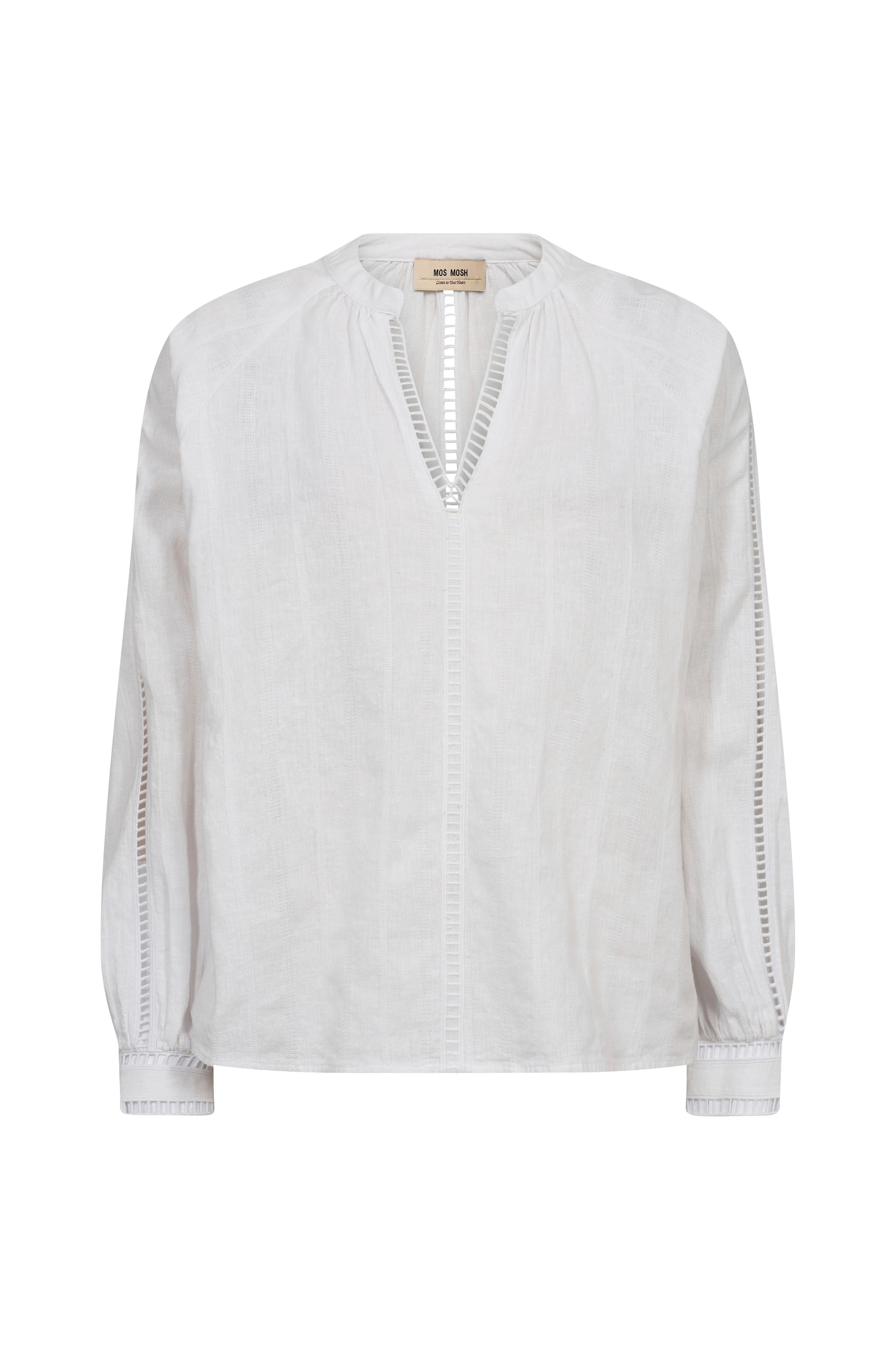 • Langt ballonærme med nedsænkede skuldre, manchet med et smalt hulbroderi og hulbroderet stribe langs siden