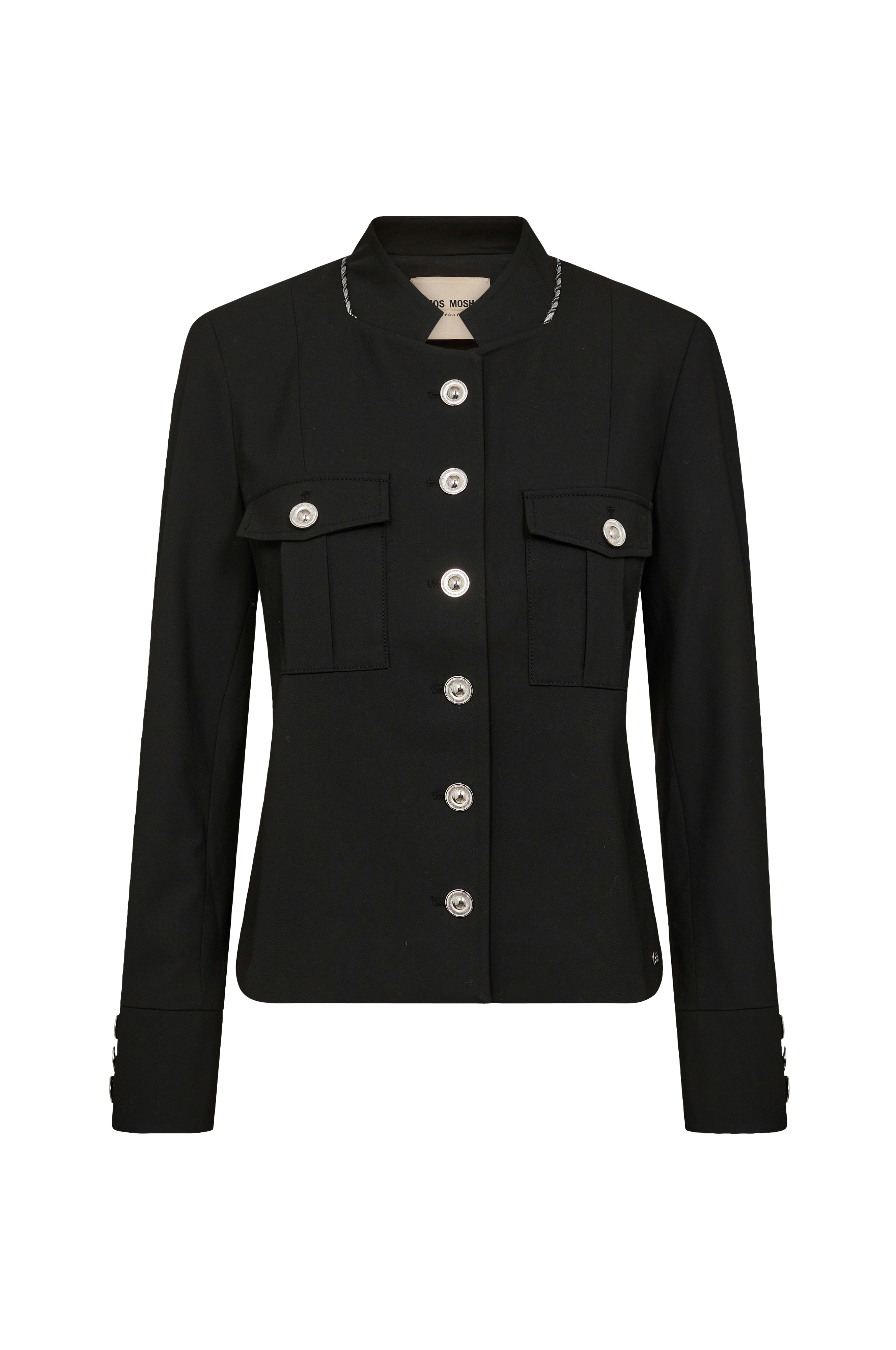 • Lige model med dekorative, sølvagtige knapper• Krave med dekorativt bånd• Brystlommer med låg• Langt ærme med manchet• Tynde skulderpuder• Foret• Længde: 56 cm i størrelse 36
