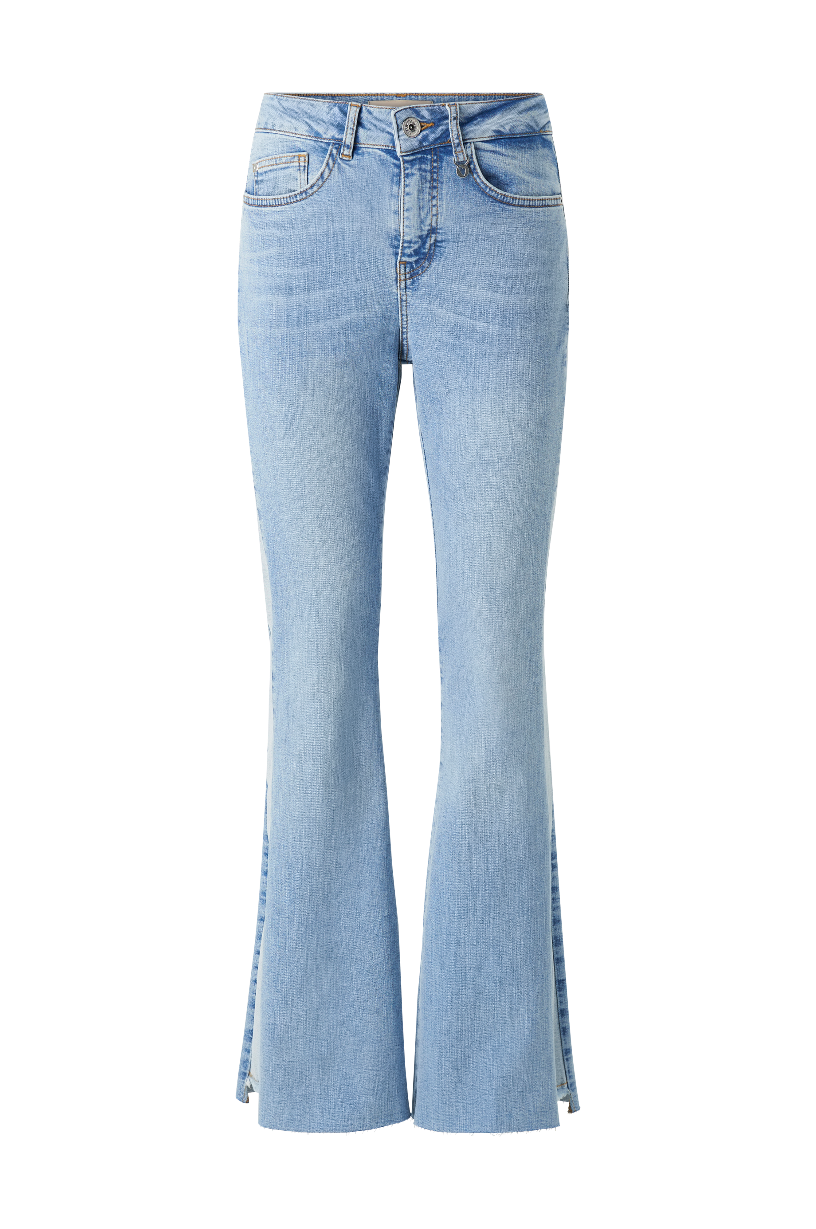 • Strækdenim• Femlommemodel• Kontrastfarvede paneler i siderne• Høj talje• Femlommemodel• Benafslutninger med svaj med rå kanter