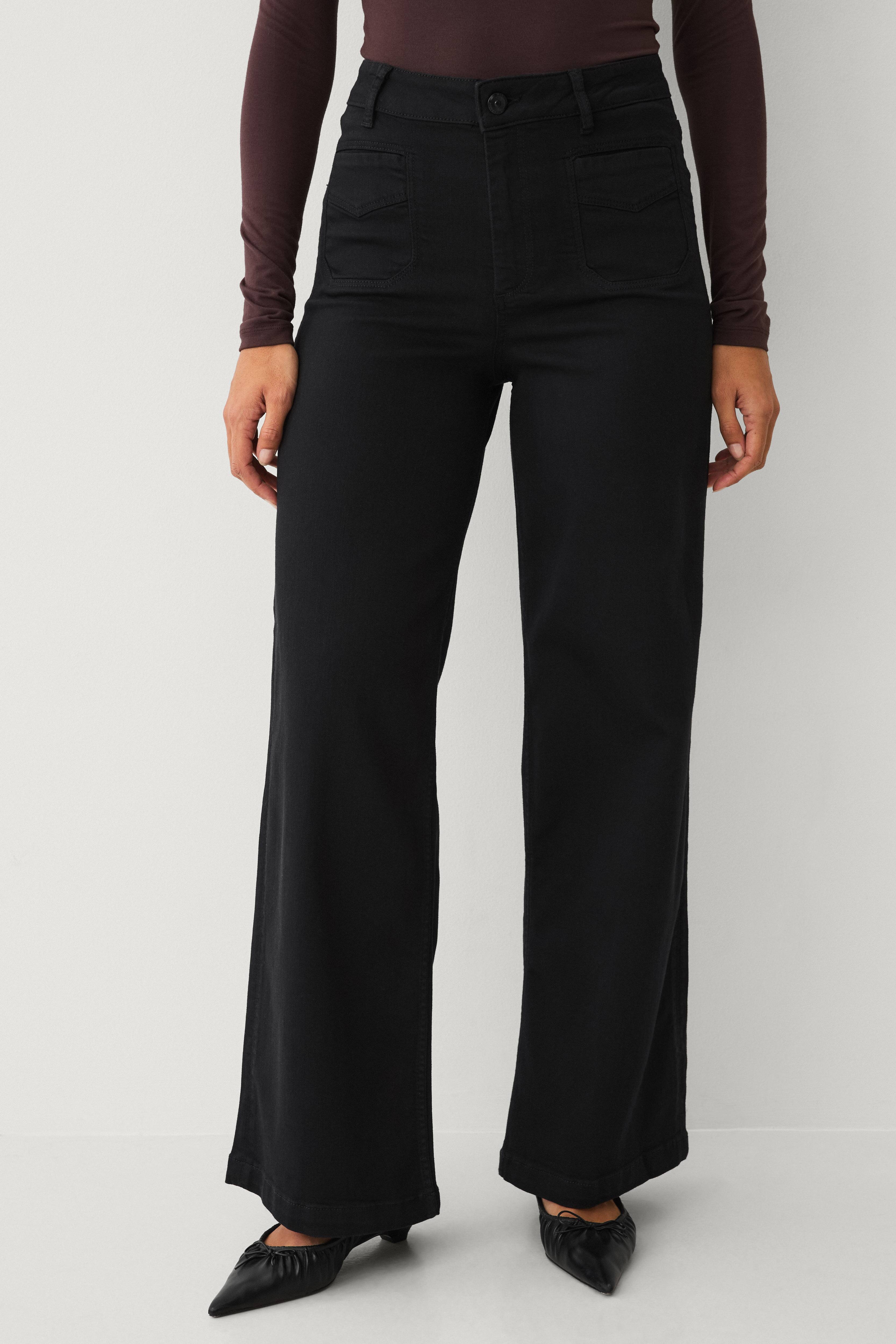 • Jeans med høj talje• Bælteløkker• To forlommer• To baglommer• Gylp med lynlås med knap på toppen• Brede ben
