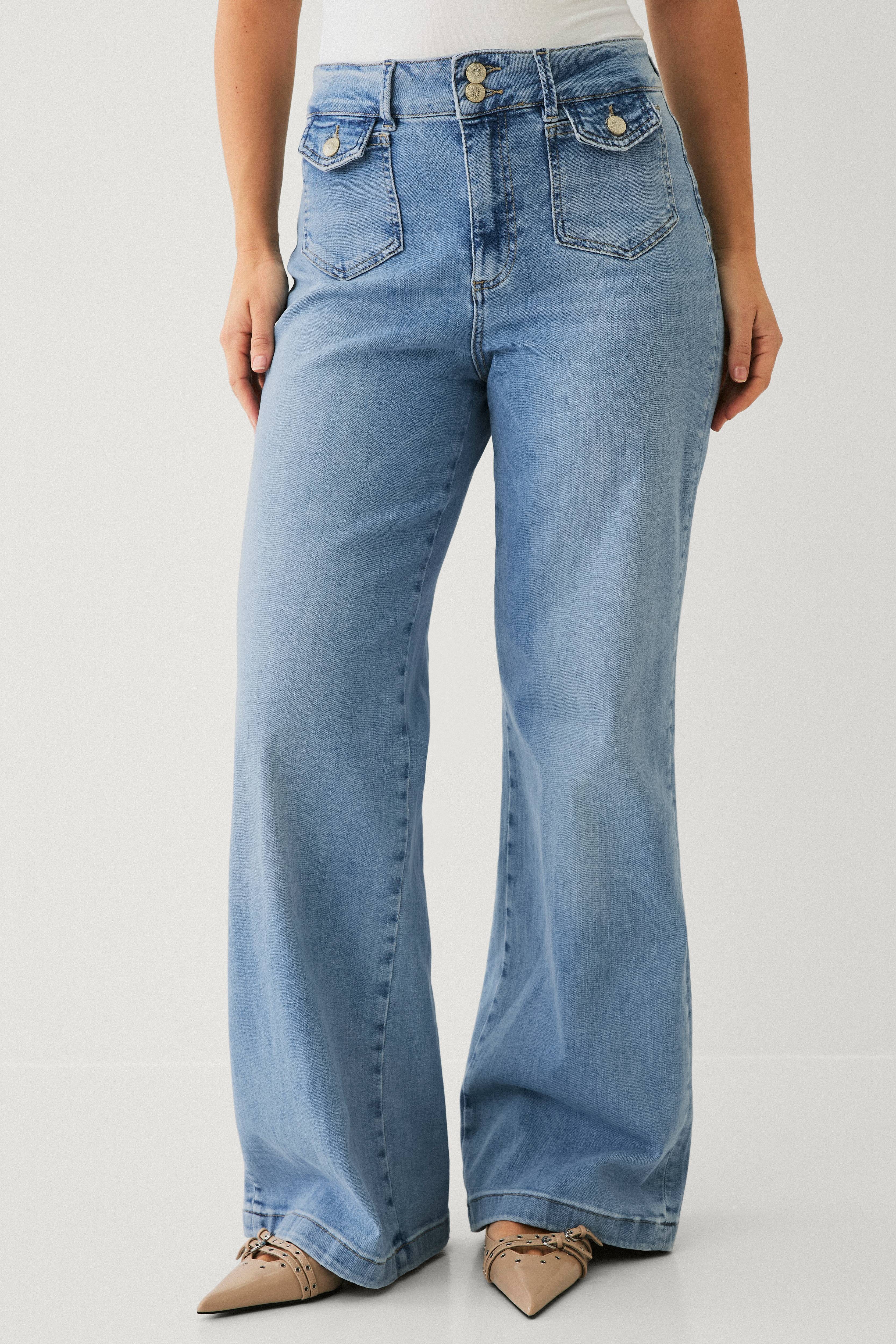 • Model med ekstra brede ben• Høj talje• Linning med stropper og guldfarvede knapper• Forlommer med lille låg• Påsyede baglommer• Indre benlængde: 81 cm i størrelse 27
