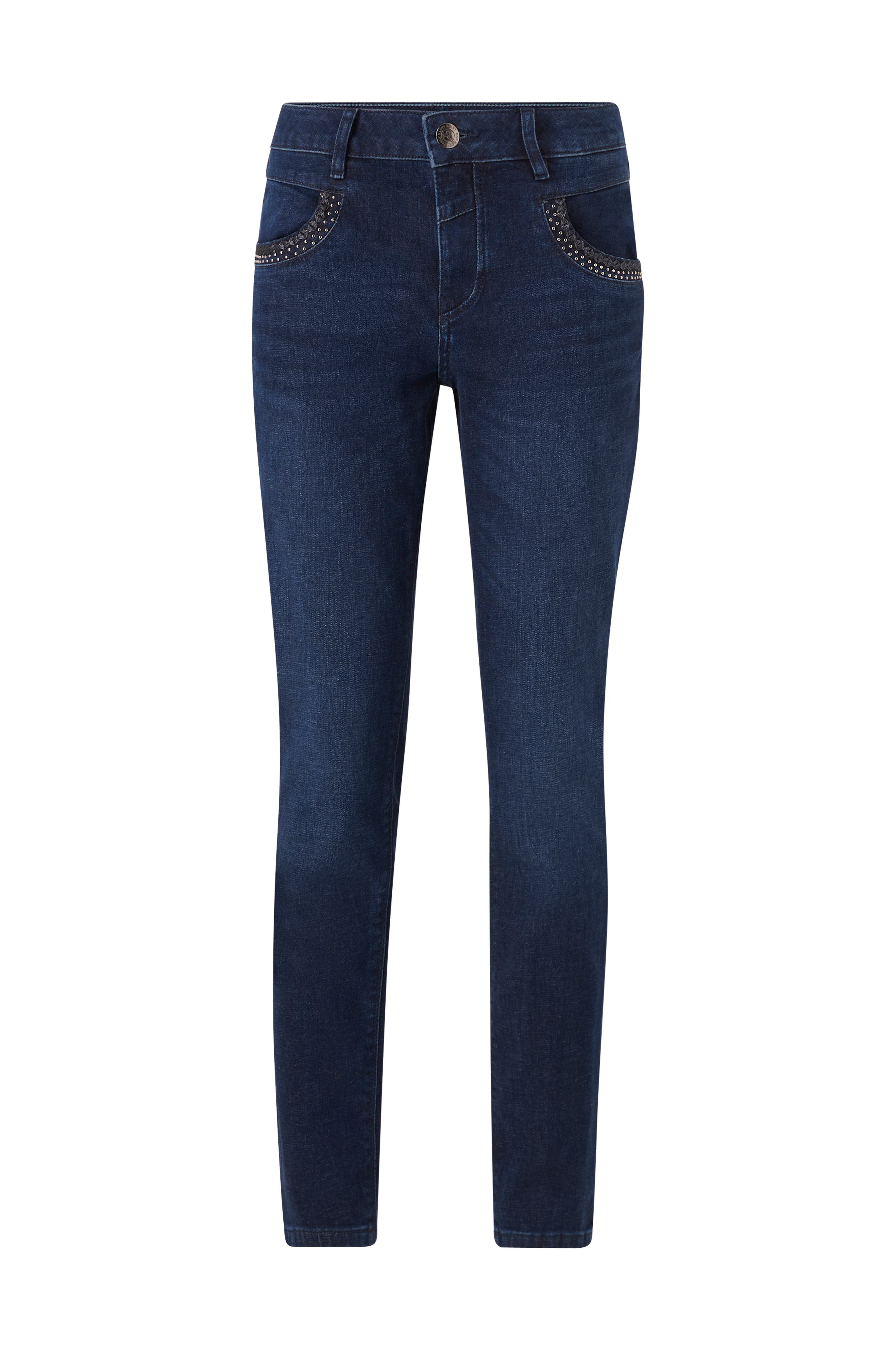 • Indsnævrende pasform• Dekorative nitter på lommerne• To baglommer• Gylp med lynlås• Fremstillet af strækdenim