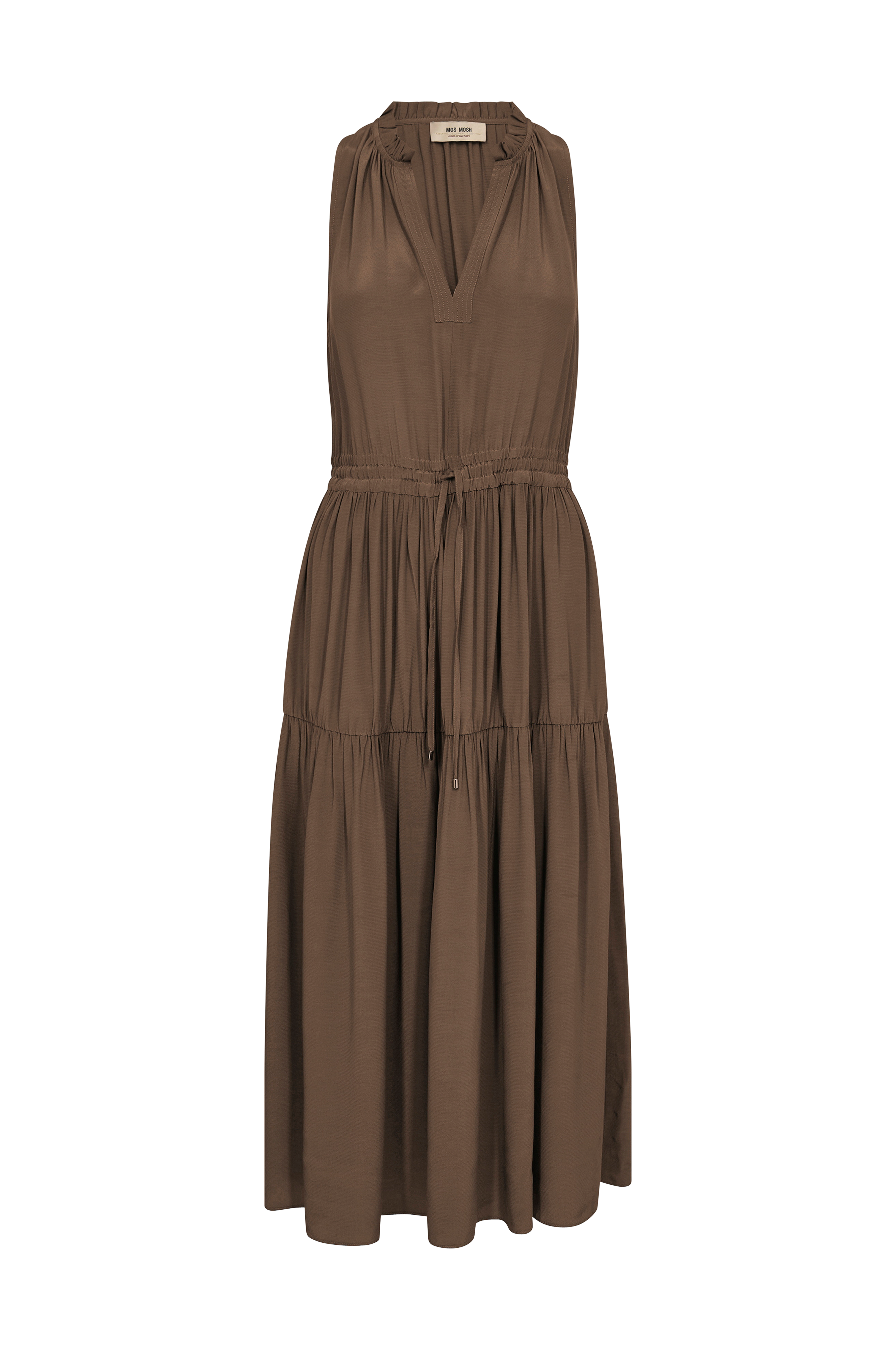 • Ærmeløs model med svaj• Volant rundt om halsen med v-udskæring foran• Elastisk talje med træksnørre• Rynket, elastisk udskæring på skørtet• Længde: 136 cm i størrelse S