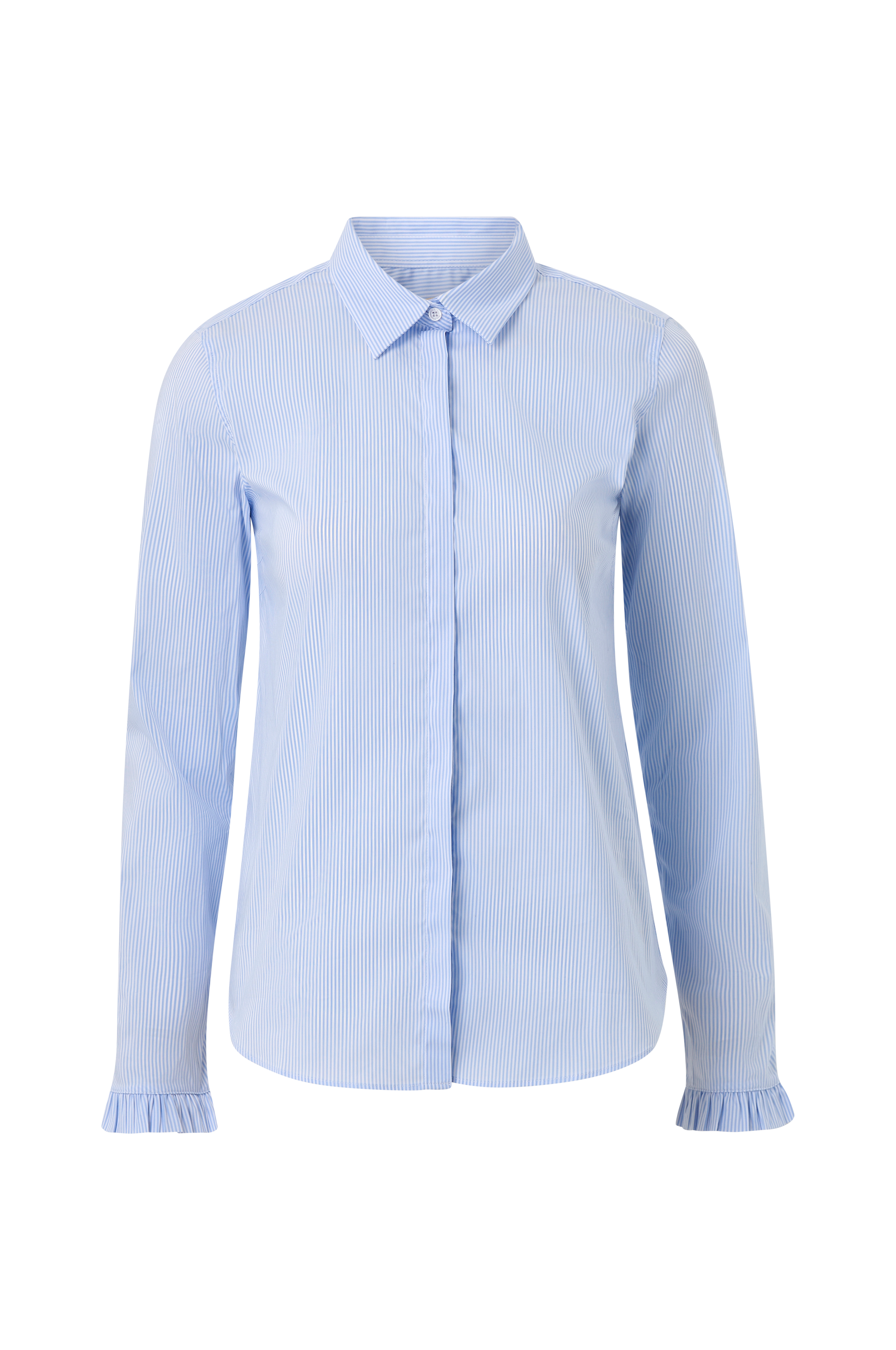 • Stribet skjorte• Krave• Lange ærmer• Volant ved manchetterne• Skjult knaplukning• Afrundet søm