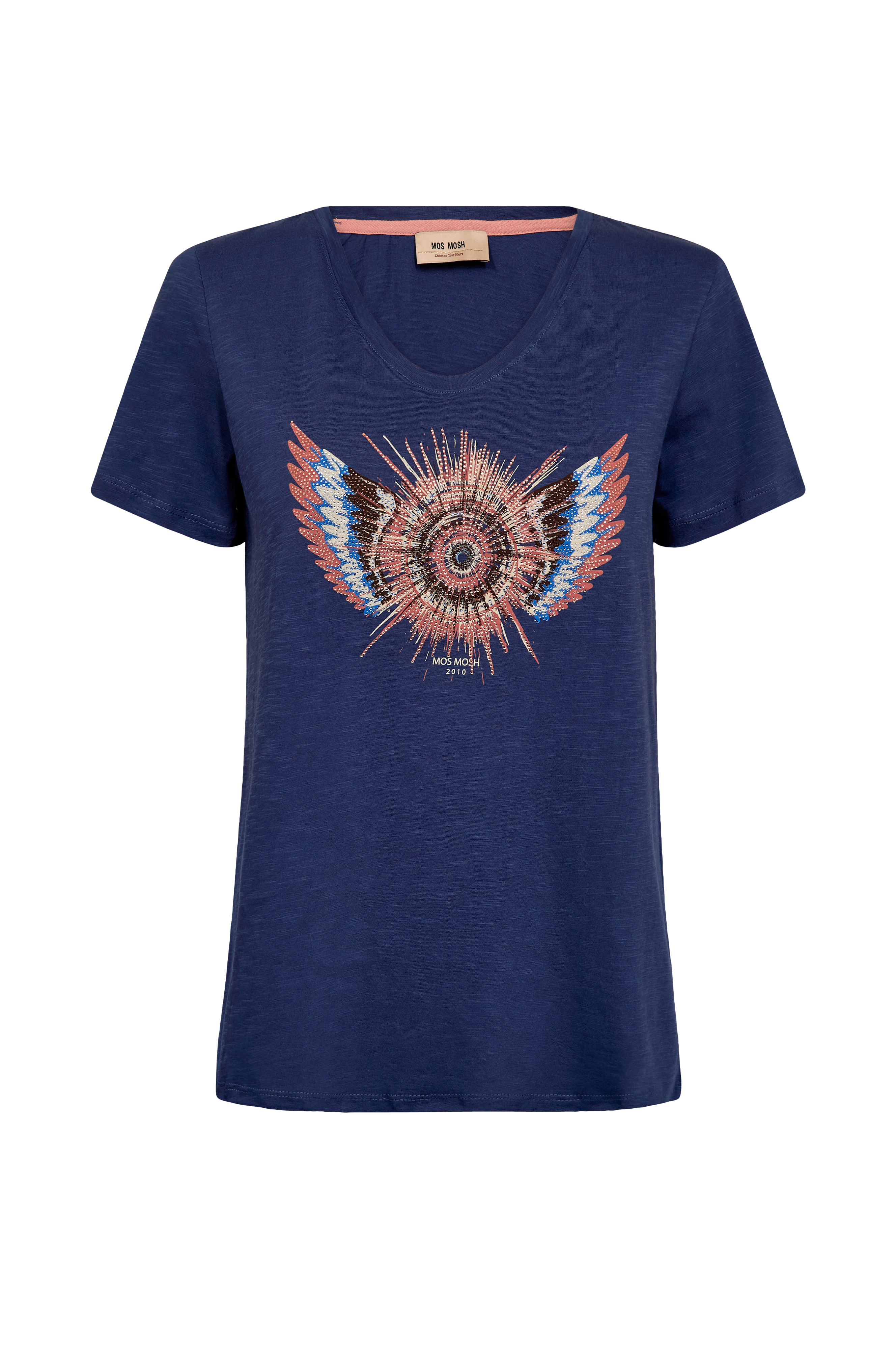 • T-shirt i bomuld• Rund halsudskæring• Tryk med rhinsten foran• Rå, let sammenrullete kanter ved manchetterne og ved nederste kant