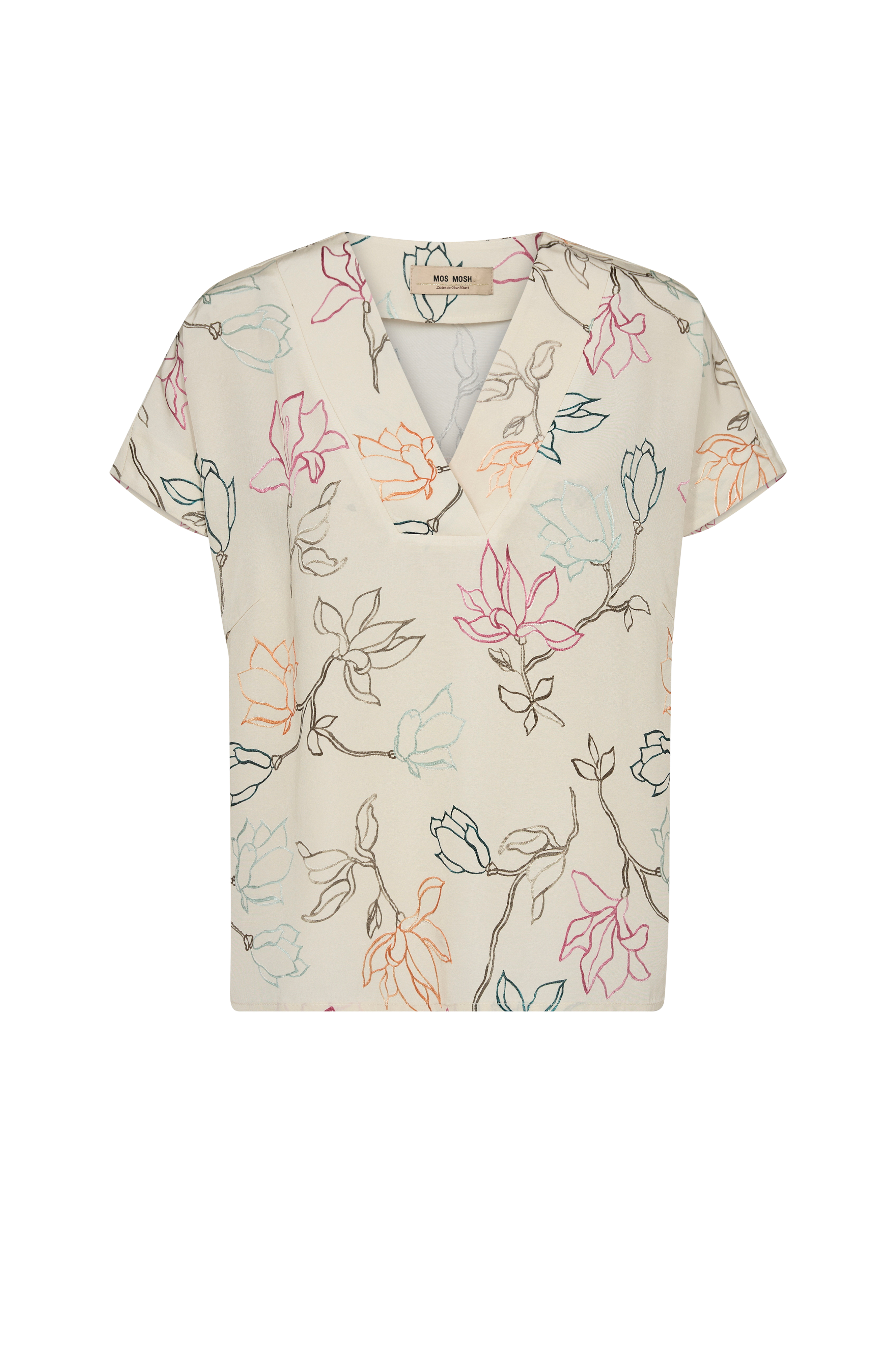 • Lige, mønstret model• V-formet halsudskæring med bred søm• Nedsænket skulder med kort ærme